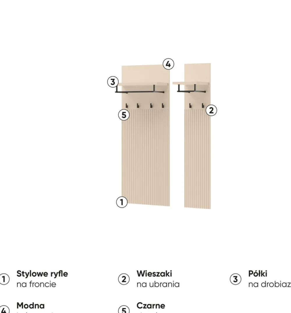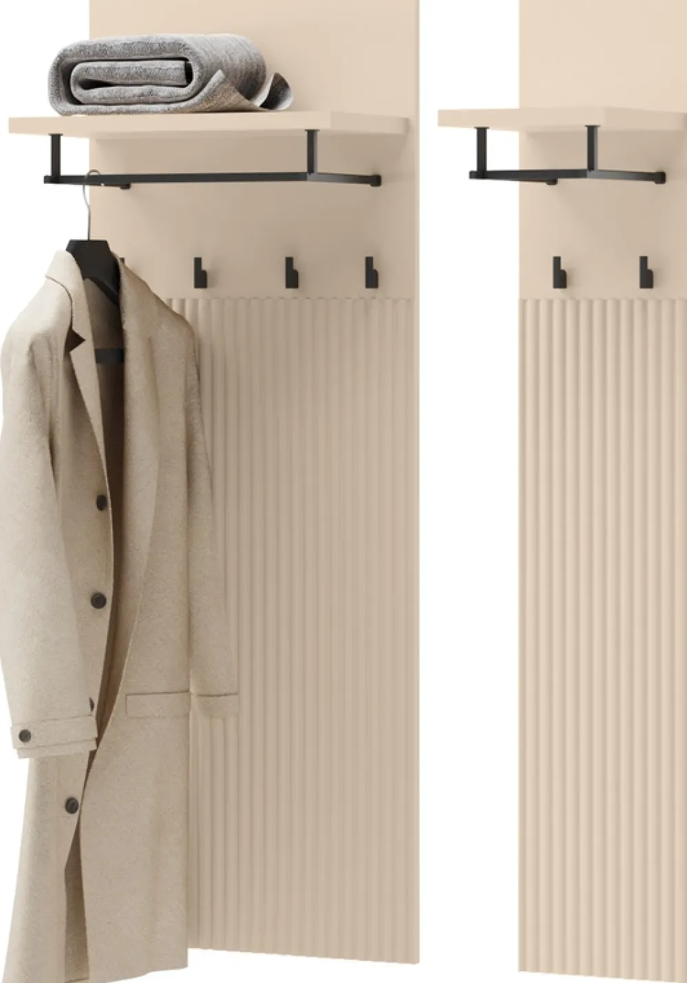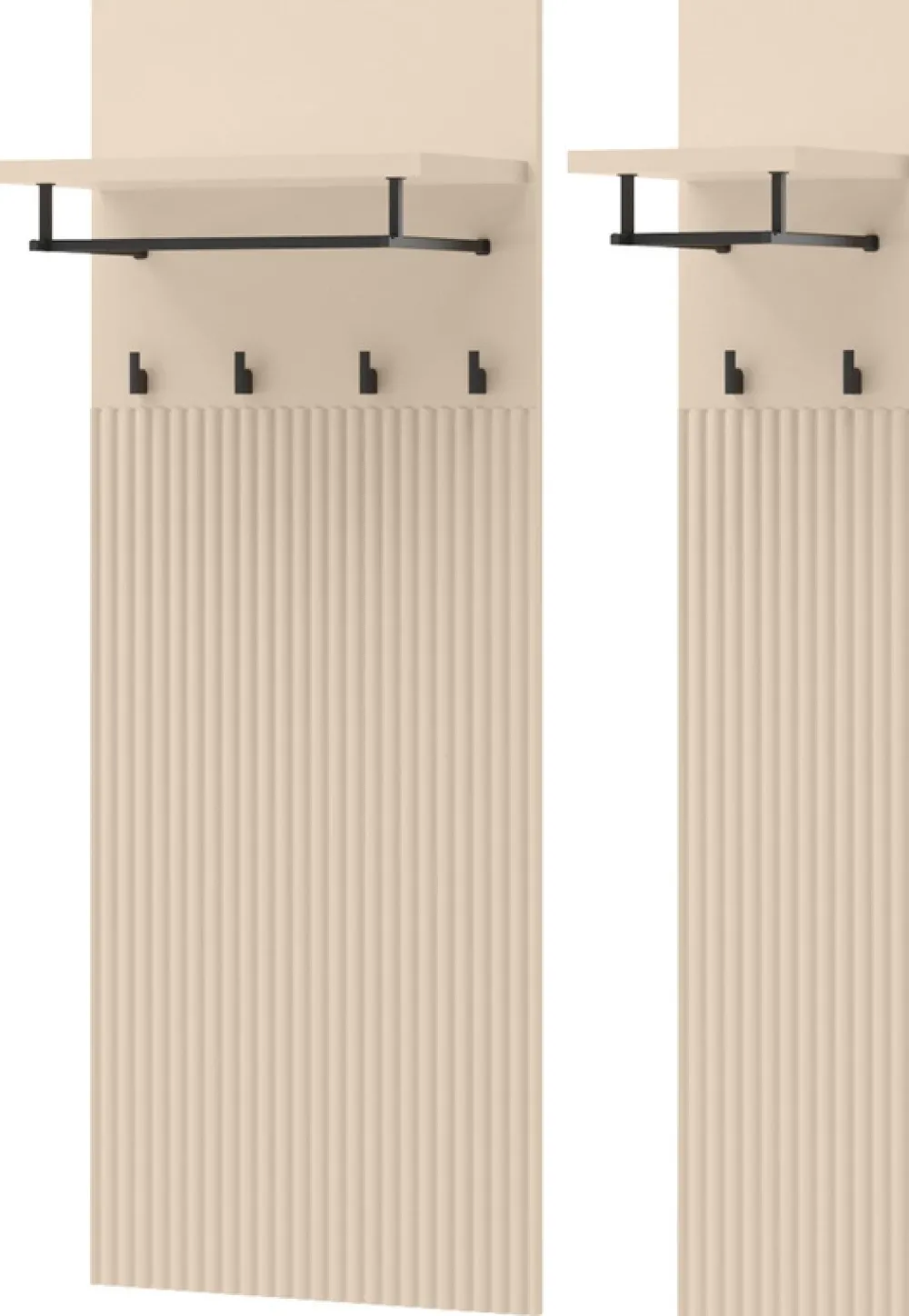 - Nowoczesny wieszak ścienny TREND z ryflowanym frontem, 7 haczykami i praktyczną półką. Kolor beż piaskowy z czarnymi detalami – idealny do garderoby, przedpokoju lub holu.