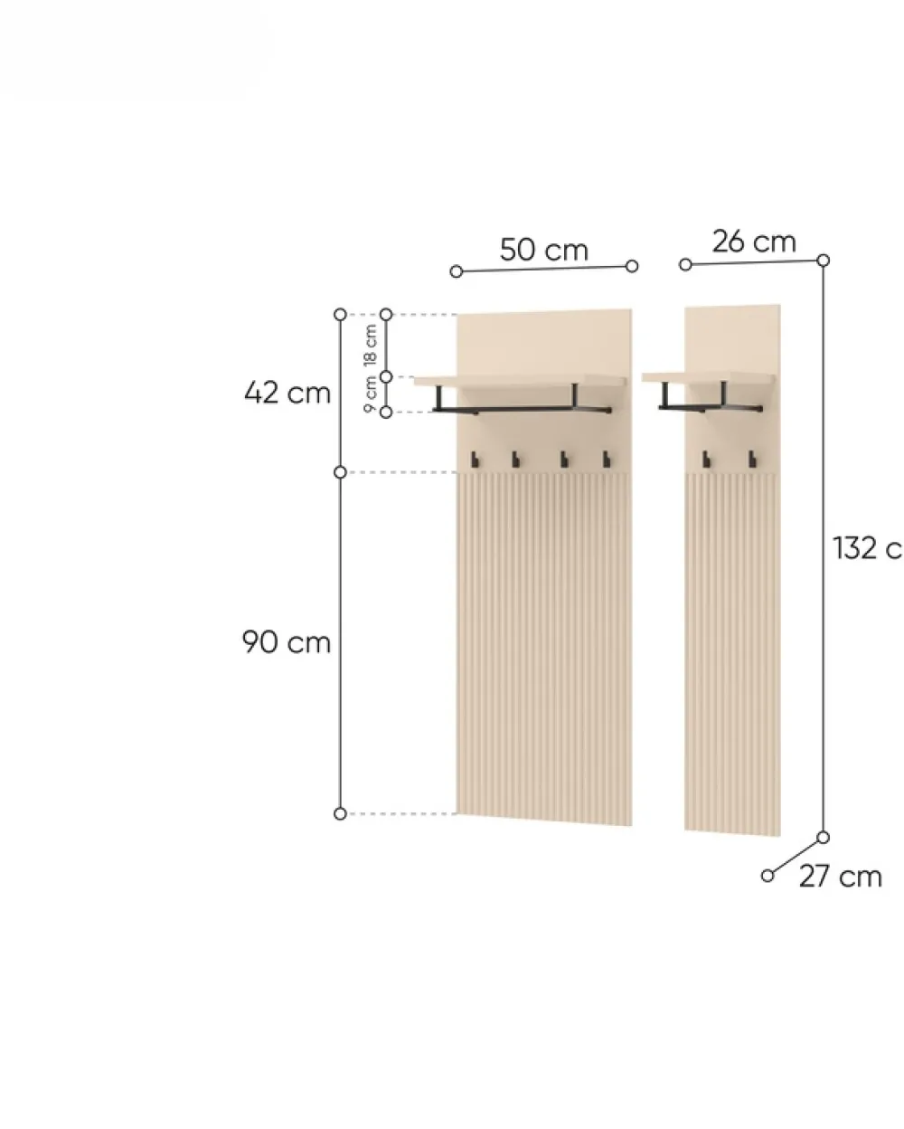 Wprowadź funkcjonalność i nowoczesny styl do swojej garderoby lub przedpokoju dzięki zestawowi paneli wieszakowych w modnym odcieniu beżu piaskowego. Ryflowane wykończenie, praktyczne haczyki i półki na drobiazgi to przemyślane rozwiązania, które pomagają utrzymać porządek i jednocześnie podkreślają elegancki charakter wnętrza.