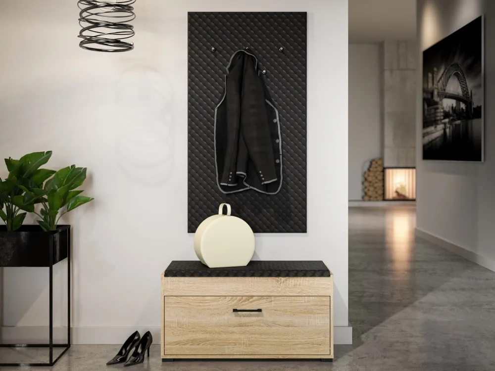 Wieszak został pokryty wysokiej jakości czarną ekoskórą, która wyróżnia się subtelnym wzorem kratki. Ten elegancki wzór dodaje meblowi wyjątkowego uroku, czyniąc go nie tylko praktycznym, ale również dekoracyjnym elementem Twojego przedpokoju. Czarna ekoskóra jest nie tylko estetyczna, ale również łatwa w utrzymaniu czystości, co sprawia, że wieszak zachowa swój nienaganny wygląd przez wiele lat.