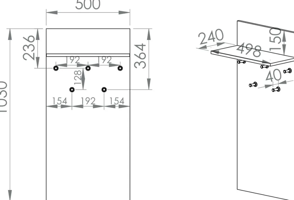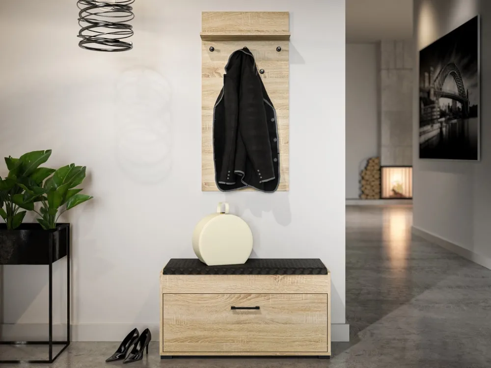 - Wieszak ścienny do przedpokoju CARO posiada 50 cm szerokości oraz 103 cm wysokości. Wieszak posiada półkę, pod półką swoje miejsce znalazło pięć uchwytów na wieszaki. Wieszak został wykonany w kolorze dąb sonoma, obrzeża wykończono okleiną ABS.