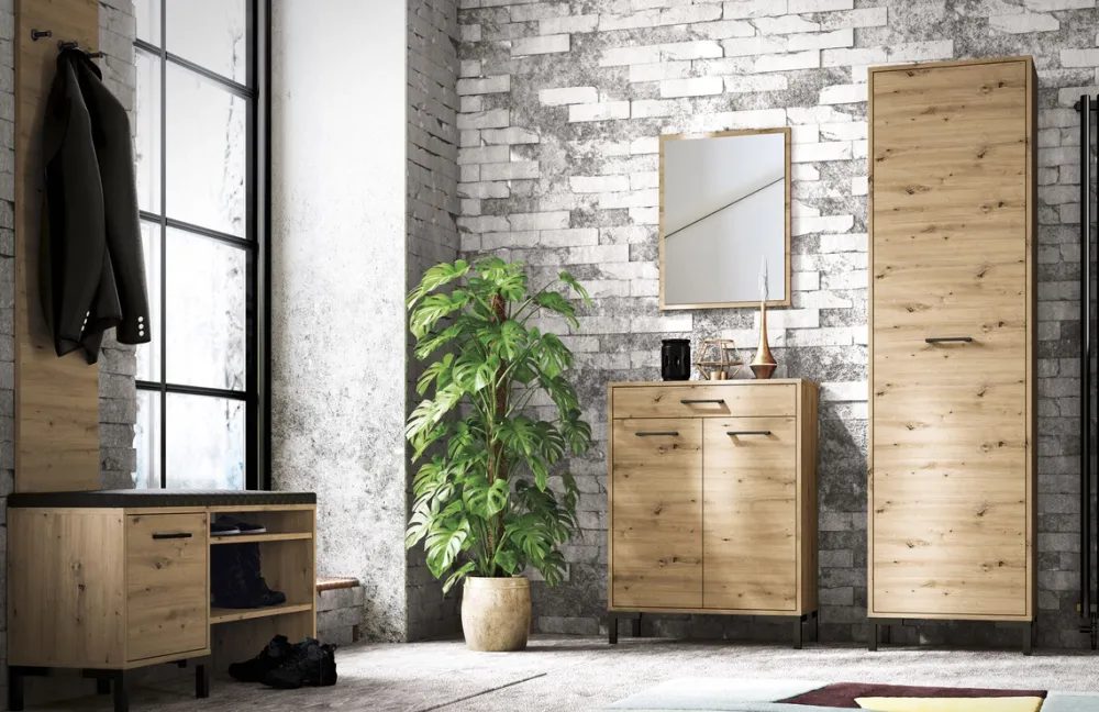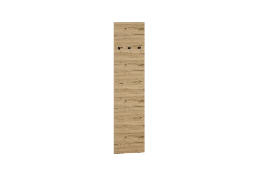 - Wieszak ścienny NEVIO do przedpokoju wykonany z płyty laminowanej w kolorze dąb artisan. Obrzeża dodatkowo zabezpieczone okleiną ABS. Wieszak o 35 cm szerokości oraz wysokości 145 cm.