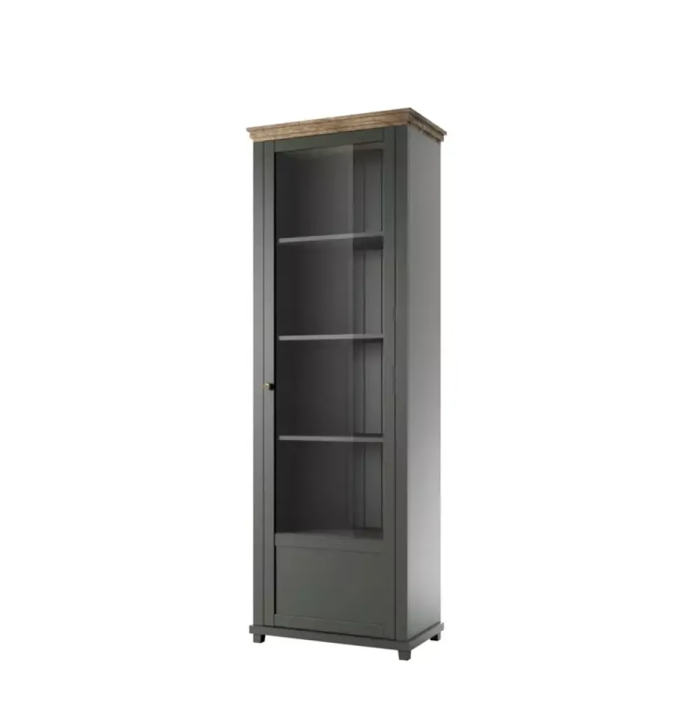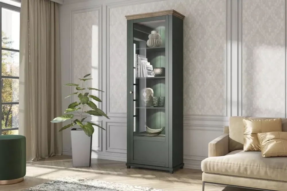 IVORIA to kolekcja mebli klasycznych o niebanalnej stylistyce. Dostępne w kolorze butelkowej zieleni w połączeniu z dębem Lefkas, idealnie wpasowuje się w dzisiejsze trendy. Dla zwolenników bardziej prowansalskich wystrojów meble dostępne są w kolorze jesion Abisko , który jest jasnym odcieniem o charakterystycznym szarym usłojeniu. Seria IVORIA to witryny, komody i wisząca półka, których uzupełnieniem jest stolik kawowy i stół rozkładany. Frezowania w blatach i frontach czy mosiężne gałki dodatkowo podkreślają styl klasyczny tej kolekcji. Dostępne bryły pozwolą państwu skomponować klasyczny salon, jadalnie czy pokój dzienny. Meble wykonano z zachowaniem najwyższych standardów technologicznych oraz jakościowych co gwarantuje długowieczność mebli.