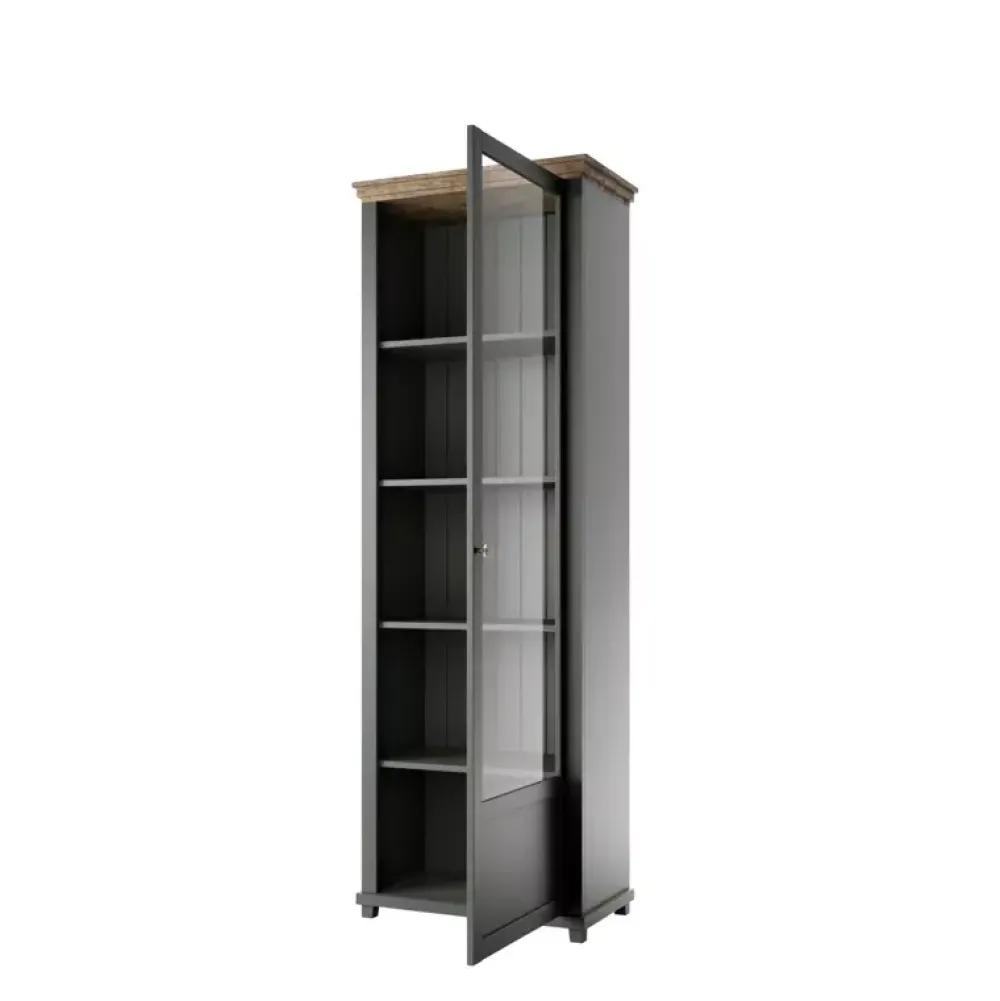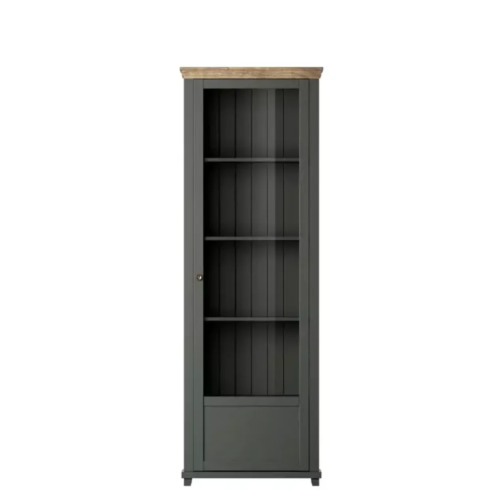 Witryna do salonu lub jadalni w stylu klasycznym o szerokości 71 cm wyposażona w drzwiczki uchylne za którymi znajdują się półki.