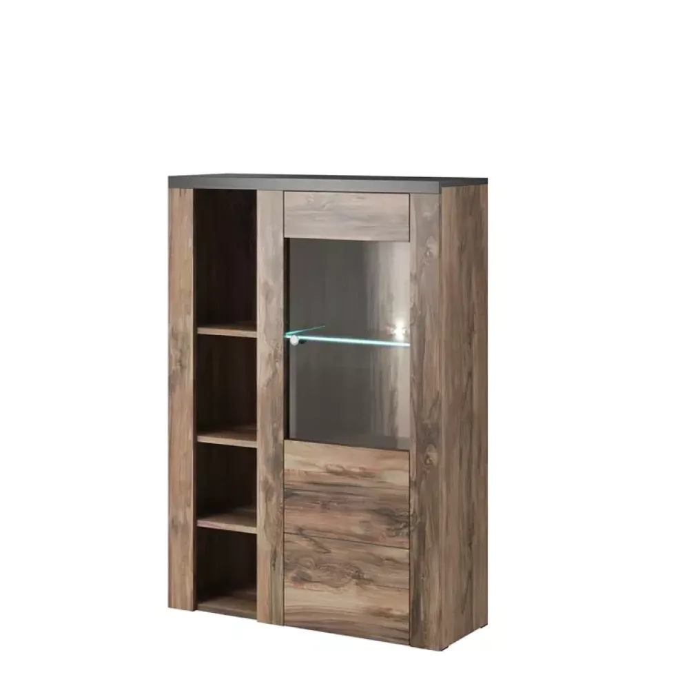 - Witryna stojąca niska o szerokości 100 cm z oszklonymi drzwiczkami i otwartymi półkami.
