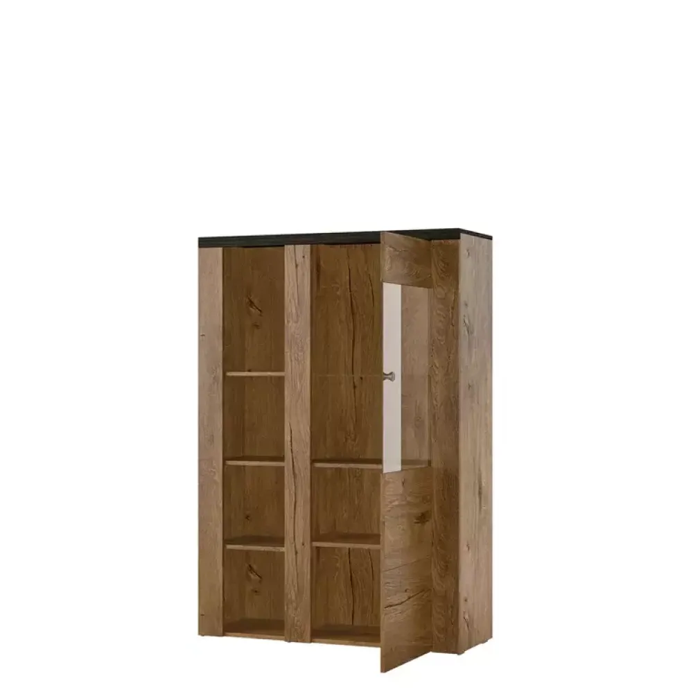 Duża witryna stojąca do salonu o szerokości 100 cm wyposażona w drzwiczki uchylne z szybą, za którymi znajdują się półki.