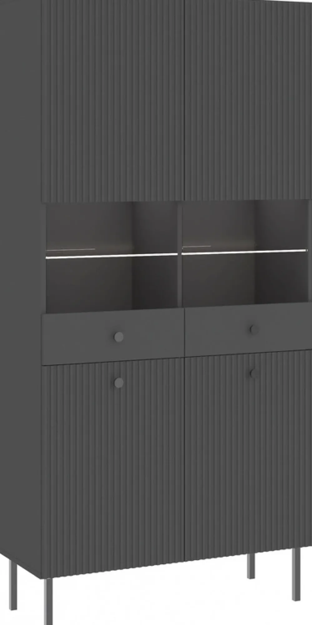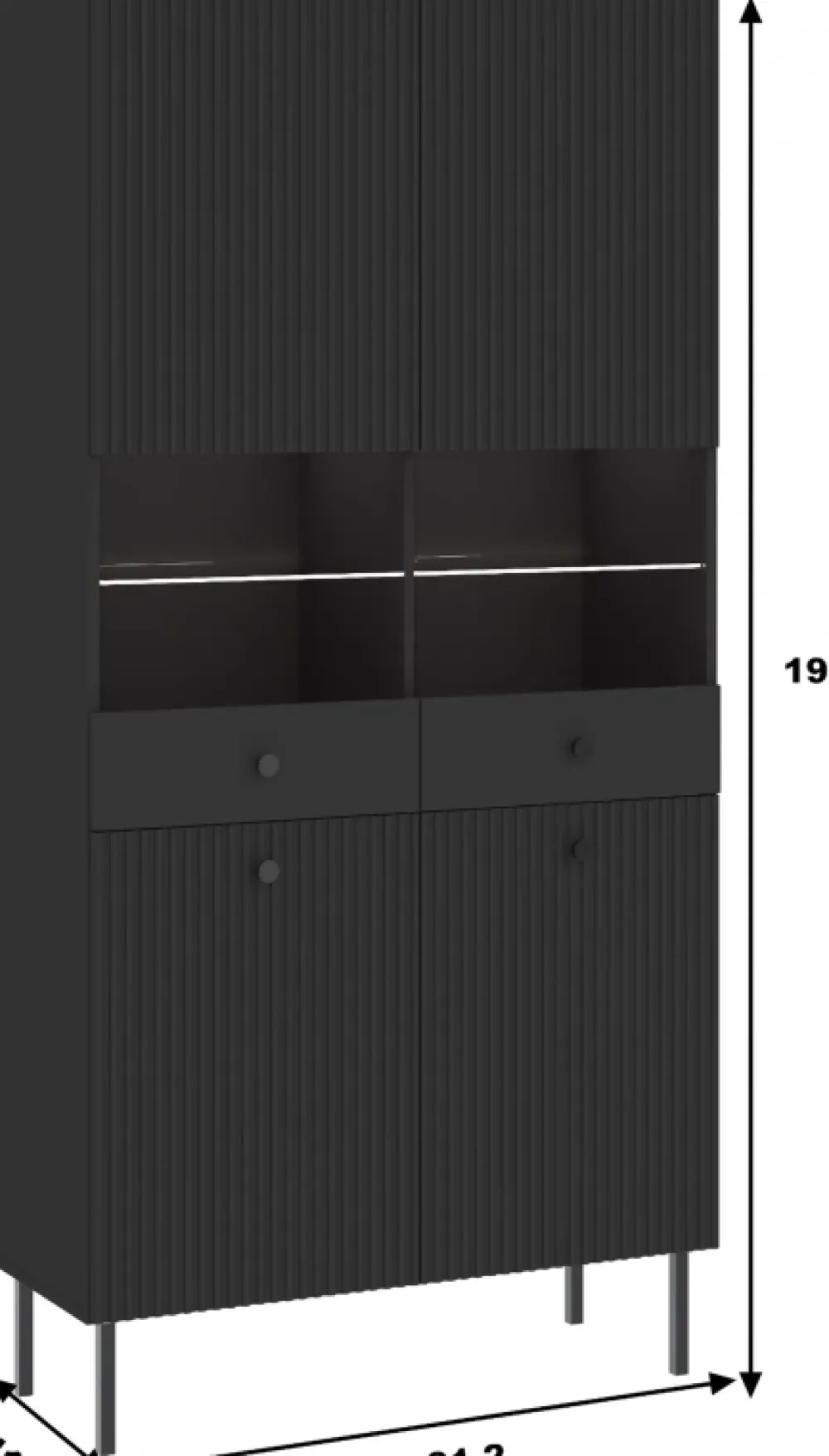 Witryna szklana do salonu VALTEO o szerokości 91 cm to doskonałe połączenie nowoczesnego stylu i funkcjonalności. Przestronne wnętrze z aż 12 półkami, w tym dwiema szklanymi z możliwością podświetlenia LED, pozwala efektownie wyeksponować dekoracje, porcelanę czy rodzinne pamiątki. To mebel, który odmieni każde wnętrze i doda mu klasy.