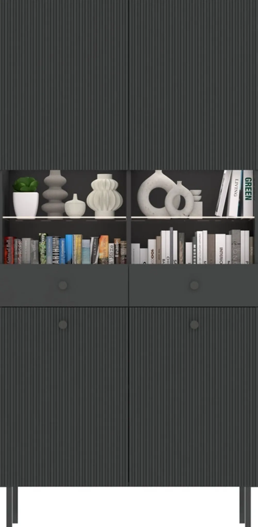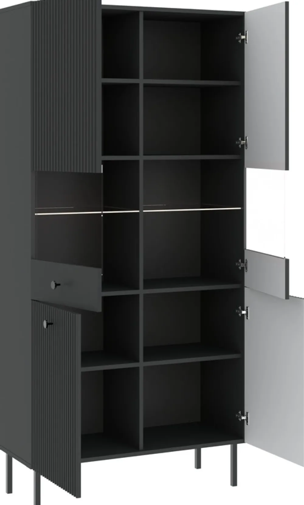 - Witryna VALTEO 91 cm z 12 półkami, w tym 2 szklanymi z opcją LED, to nowoczesny mebel do salonu. Czarne matowe wykończenie i metalowe nóżki dodają wnętrzu elegancji, podkreślając styl wyeksponowanych dekoracji.