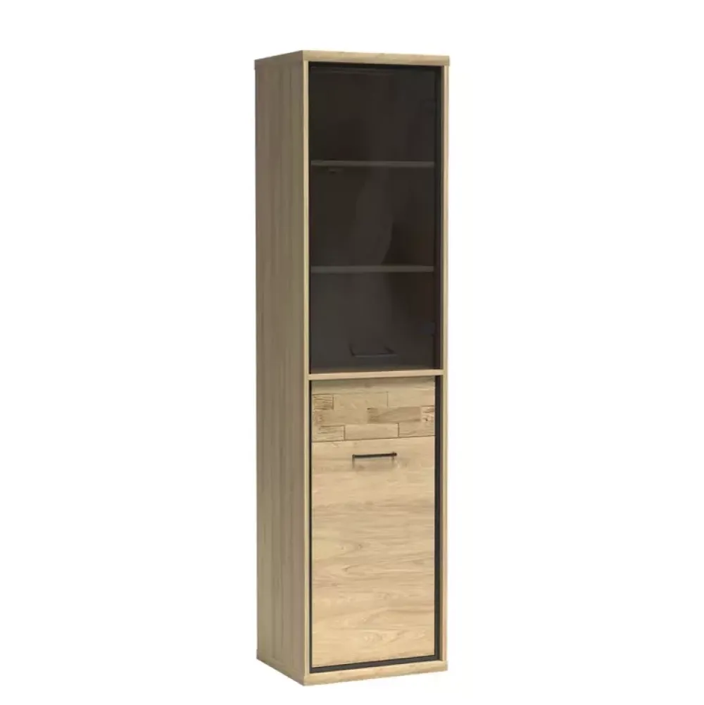 - Witryna MORNE została wyposażona w półkę która kryje się za drzwiami, dzięki której twoje akcesoria zyskają odrobinę prywatności. Dodatkowo posiada dwie półki umieszczone za przejrzystym szkłem witryny, które są dostępne z opcjonalnym podświetleniem.