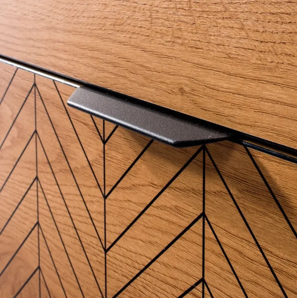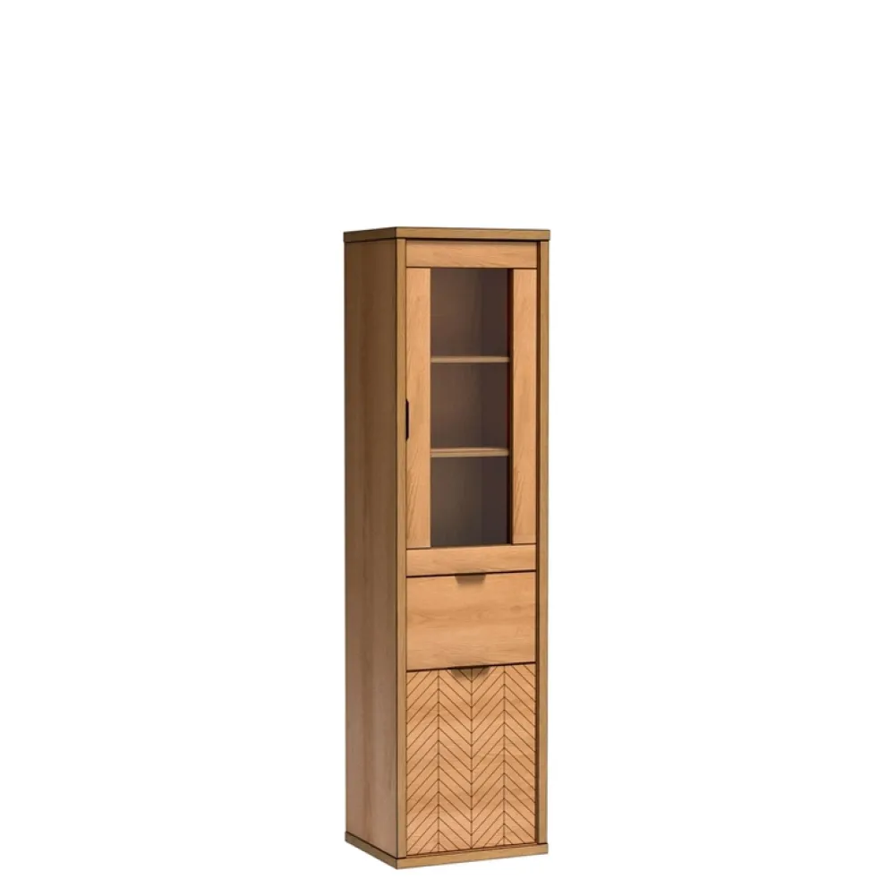 Wyjątkowość tej witryny podkreśla frezowany wzór na froncie, nawiązujący do kształtu czarnej jodełki. To stylowy detal, który dodaje meblowi niepowtarzalnego charakteru.