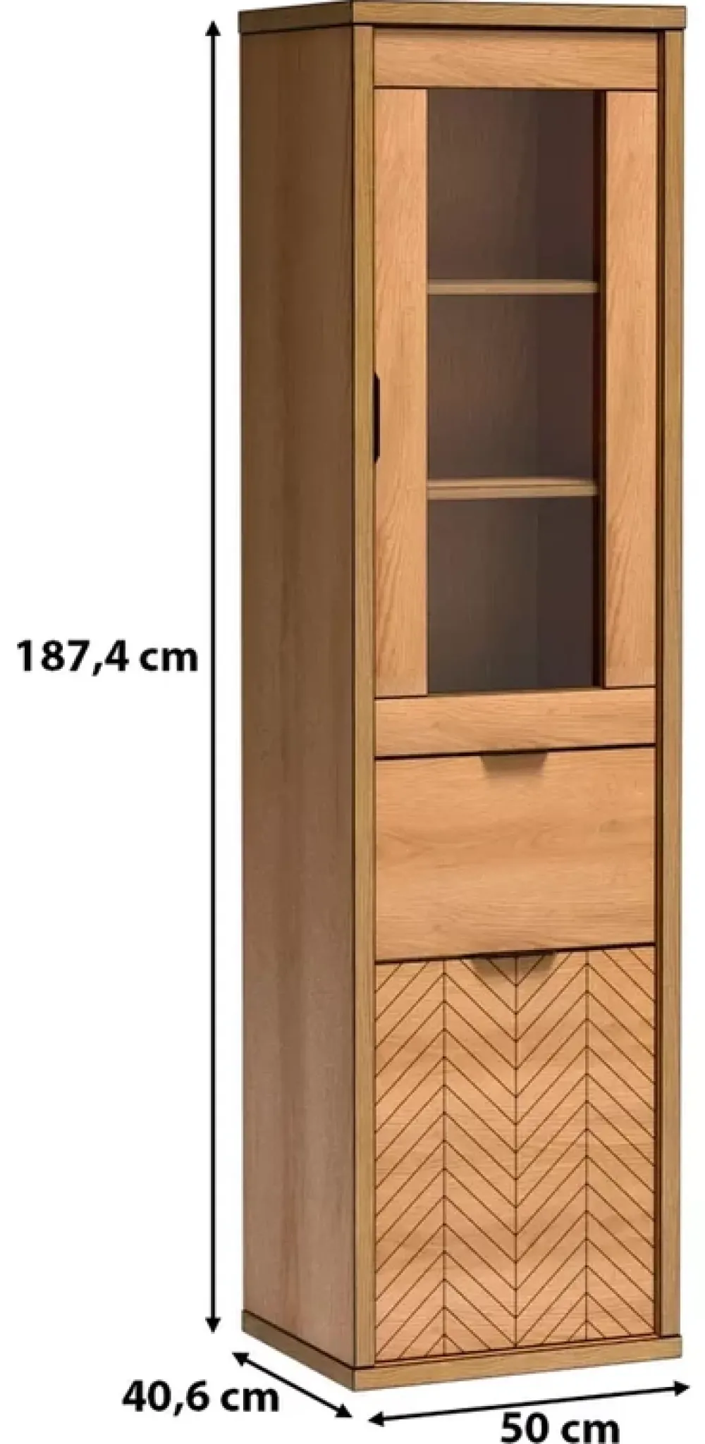- Ożyw swój salon z naszą witryną FONETTI w kolorze dębu karmel. Frezowany wzór czarnej jodełki na froncie dodaje unikalnego charakteru. To doskonałe połączenie funkcjonalności i stylu, które z pewnością wzbogaci Twoją przestrzeń.
