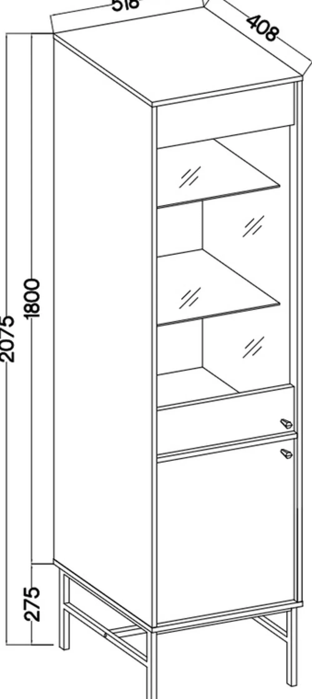 Górne przeszklone drzwi stanowią centralny punkt witryny, umożliwiając wyeksponowanie najcenniejszych dekoracji. Za nimi znajdują się dwie przestronne półki, które oferują mnóstwo miejsca na książki, ozdoby czy inne ważne dla Ciebie przedmioty.