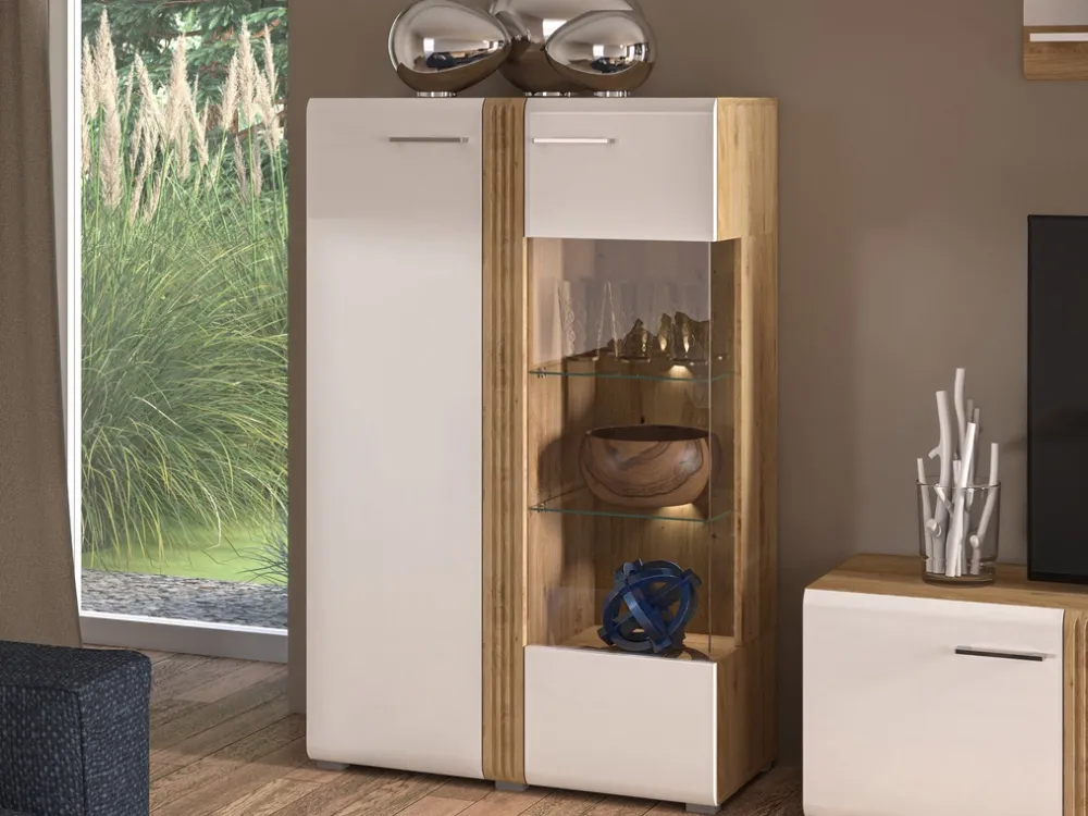 Po prawej stronie witryny znajdują się eleganckie drzwi z przeszkleniem, które dodają lekkości i nowoczesnego charakteru. Za nimi kryją się dwie szklane półki, na których możesz wyeksponować swoje ulubione dekoracje, pamiątki rodzinne czy stylowe bibeloty. Przeszklenie wprowadza do wnętrza więcej światła, tworząc przyjemną i ciepłą atmosferę.