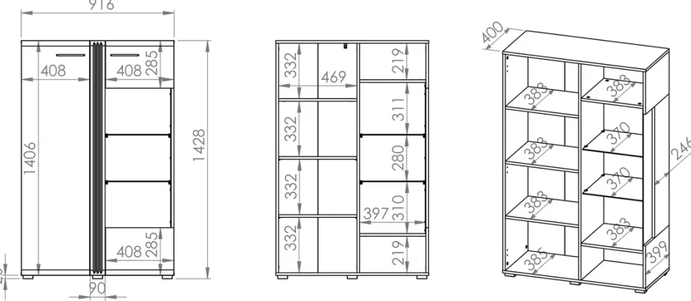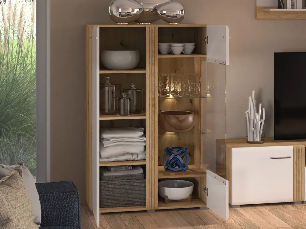 Z lewej strony witryny znajdują się pełne drzwi, za którymi ukryte są cztery pojemne półki. To doskonałe rozwiązanie do przechowywania przedmiotów, które chcesz mieć pod ręką, ale poza zasięgiem wzroku. Dzięki temu Twoje wnętrze pozostaje schludne i zorganizowane, a Ty możesz cieszyć się estetycznym porządkiem.
