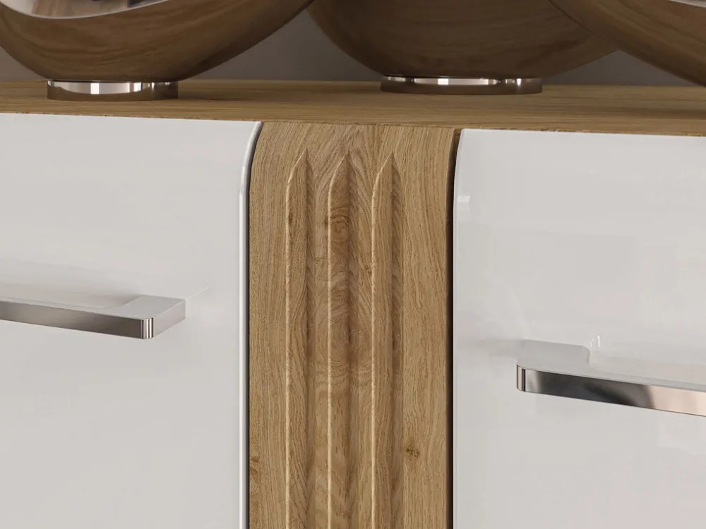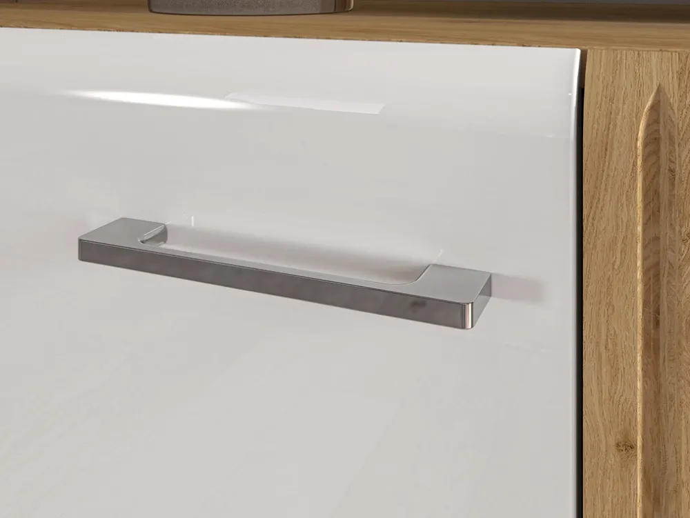 Nasza witryna wyróżnia się nie tylko funkcjonalnością, ale także stylowym wykończeniem. Chromowane metalowe uchwyty dodają elegancji i nowoczesnego wyglądu, idealnie komponując się z białymi frontami mebli. Są nie tylko estetyczne, ale również wytrzymałe i wygodne w użyciu.