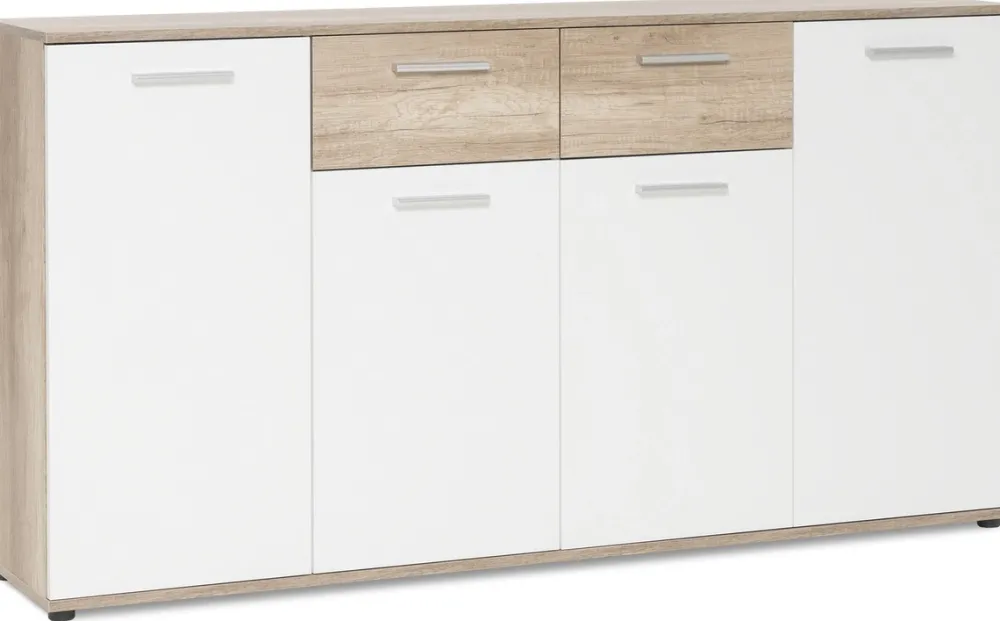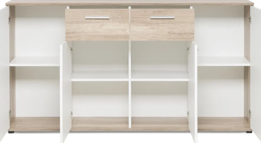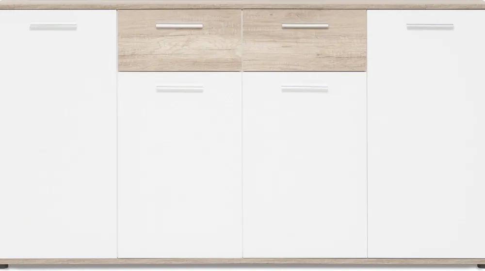Komoda 160 cm to doskonałe połączenie stylu i praktyczności, stworzone z myślą o tych, którzy cenią sobie estetykę i wygodę użytkowania. Komoda wyposażona jest w cztery drzwi, za którymi kryją się przestronne półki oraz dwie szuflady umieszczone w górnej części mebla, co zapewnia doskonałą organizację przechowywanych przedmiotów. To rozwiązanie gwarantuje nie tylko wygodę użytkowania, ale także długotrwałą trwałość, dzięki czemu możesz cieszyć się bezproblemowym dostępem do przechowywanych rzeczy każdego dnia.