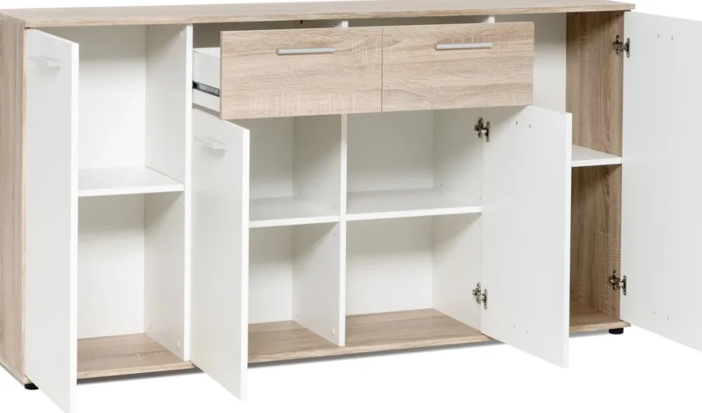 Za każdymi z czterech drzwi komody kryją się półki, które idealnie nadają się do przechowywania większych przedmiotów, takich jak książki, dokumenty, tekstylia czy naczynia. Dwie szuflady umieszczone w górnej części mebla pozwalają na uporządkowanie drobniejszych elementów, takich jak akcesoria, sztućce czy inne codzienne drobiazgi. Taki układ pomaga utrzymać porządek i sprawia, że wnętrze Twojego salonu, sypialni czy jadalni pozostaje wolne od bałaganu. Komoda z szufladami JOVITA to idealne rozwiązanie do przechowywania różnorodnych przedmiotów, pomagając utrzymać ład w Twoim domu.