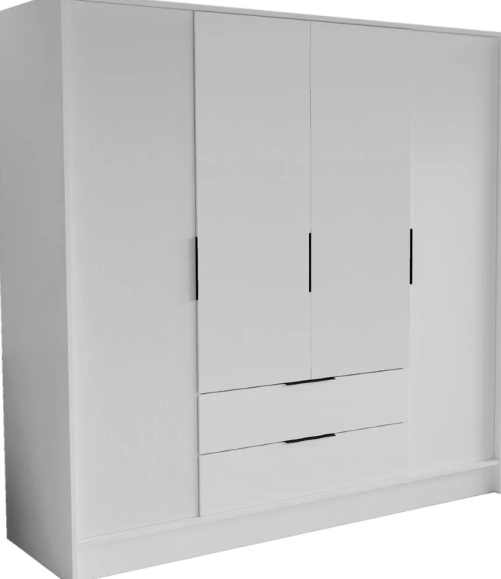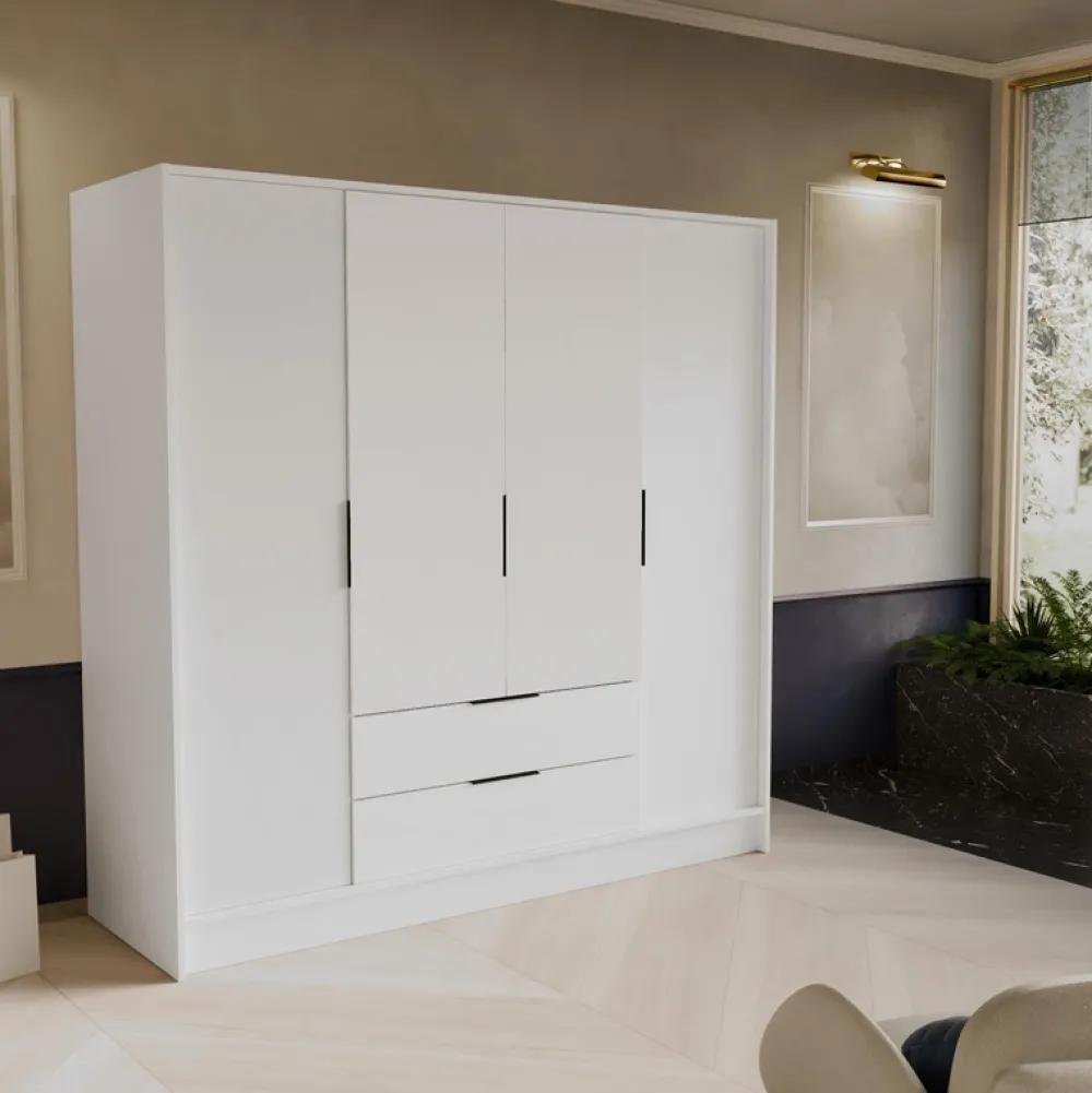 Szukasz pojemnej i stylowej szafy, która pomieści całą Twoją garderobę? Model o szerokości 200 cm NUBIA to idealne rozwiązanie dla osób ceniących porządek i funkcjonalność. Dzięki przemyślanemu układowi wnętrza oraz nowoczesnym detalom, takim jak czarne uchwyty, szafa doskonale sprawdzi się w sypialni, garderobie czy przedpokoju.