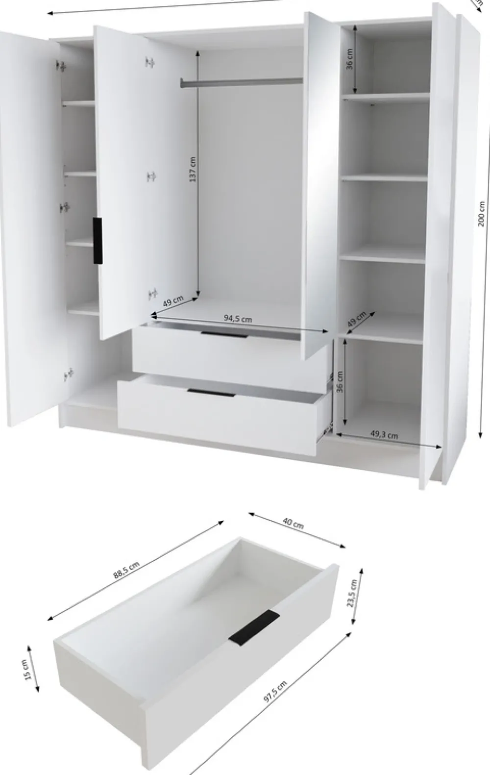 - Szafa uchylna 200 cm NUBIA posiada drążek na wieszaki i dwie szuflady osadzone na prowadnicach kulkowych w środkowej części. Po prawej i lewej stronie znajdują się drzwi, a za nimi półki na ubrania.