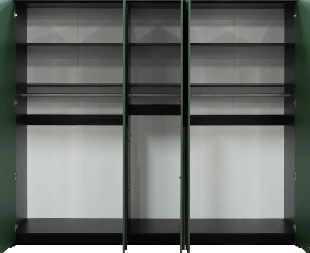 Za każdą parą drzwi znajdują się dwie pojemne półki oraz drążek na wieszaki. Półki są idealnym miejscem na przechowywanie poskładanych ubrań, takich jak swetry, koszulki czy ręczniki, natomiast drążek na wieszaki doskonale sprawdzi się do organizacji odzieży wiszącej, takiej jak płaszcze, sukienki czy marynarki. Taki układ pozwala na maksymalną wygodę i porządek w przechowywaniu garderoby.