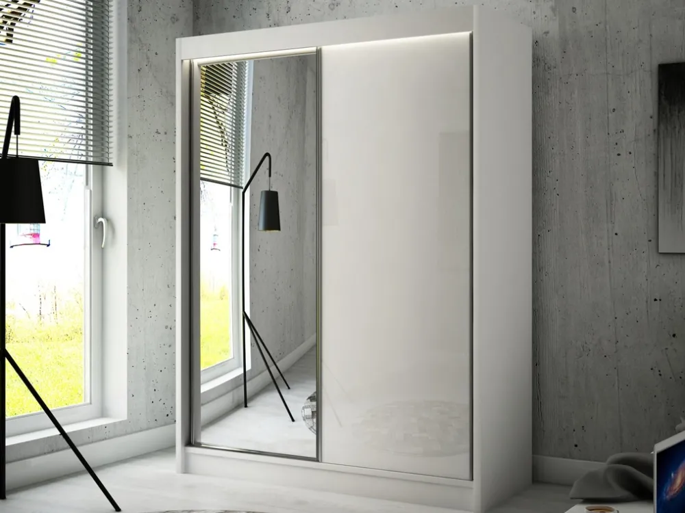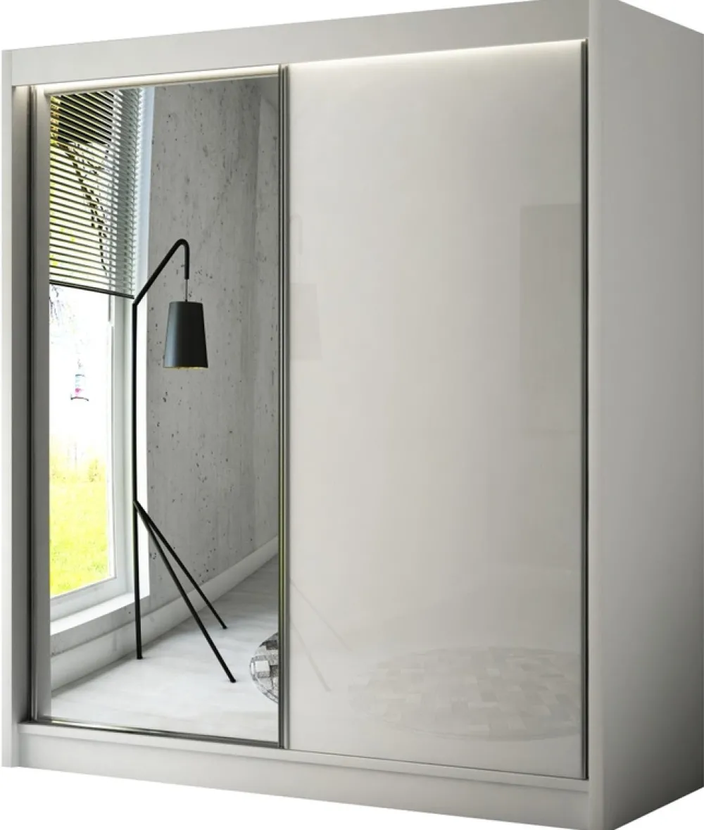 - Szafa przesuwna z lustrem 150 cm VARENO posiada lustro umieszczone na lewym froncie, oraz prawe drzwi wykończone na wysoki połysk. Drzwi szafy poruszają się na solidnej, metalowej prowadnicy. Szafa posiada wiele półek oraz drążek na wieszaki.