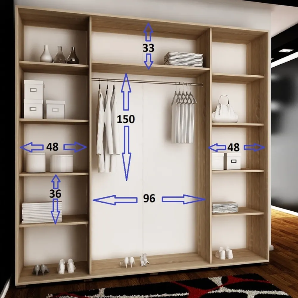 Szafa przesuwna TARO w kolorze dąb sonoma to harmonijne połączenie ciepłego, naturalnego wyglądu drewna z funkcjonalnym wnętrzem. Jasne wybarwienie nadaje przytulności, a duże lustra na frontach powiększają optycznie pomieszczenie. Szerokość 200 cm zapewnia mnóstwo miejsca na całą garderobę.