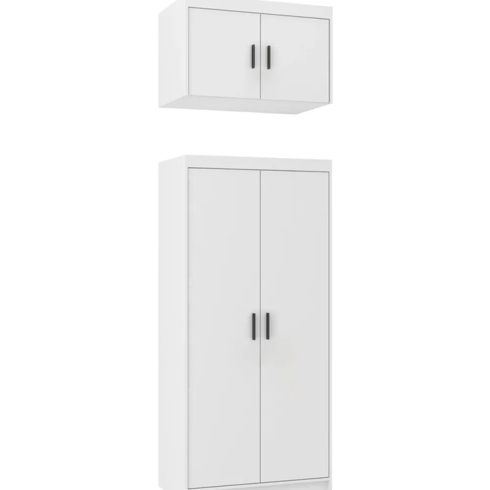 - Szafa z nadstawką KUBA 89 cm w kolorze białym. Szafa z półkami i drążkiem + nadstawka z półką. Matowe wykończenie, czarne uchwyty, 15 mm laminat. Praktyczne i eleganckie przechowywanie w kompaktowej formie. Idealna do garderoby lub przedpokoju.