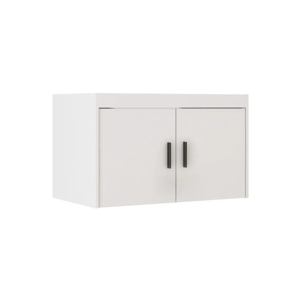 Wybierz szafę KUBA z nadstawką w kolorze białym i stwórz uporządkowaną, jasną przestrzeń do przechowywania z eleganckim wykończeniem.