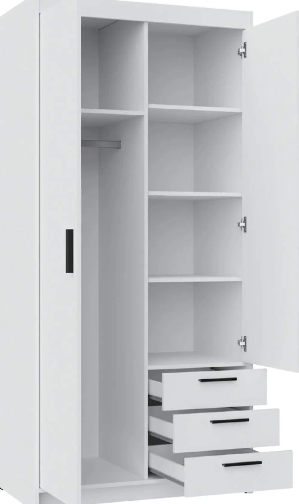 - Szafa modułowa dwudrzwiowa KUBA w kolorze dąb sonoma posiada 90 cm szerokości, w skład których wchodzą trzy szuflady osadzone na prowadnicach kulkowych oraz pięć półek i aluminiowy drążek na wieszaki. Szafa posiada srebrne uchwyty.