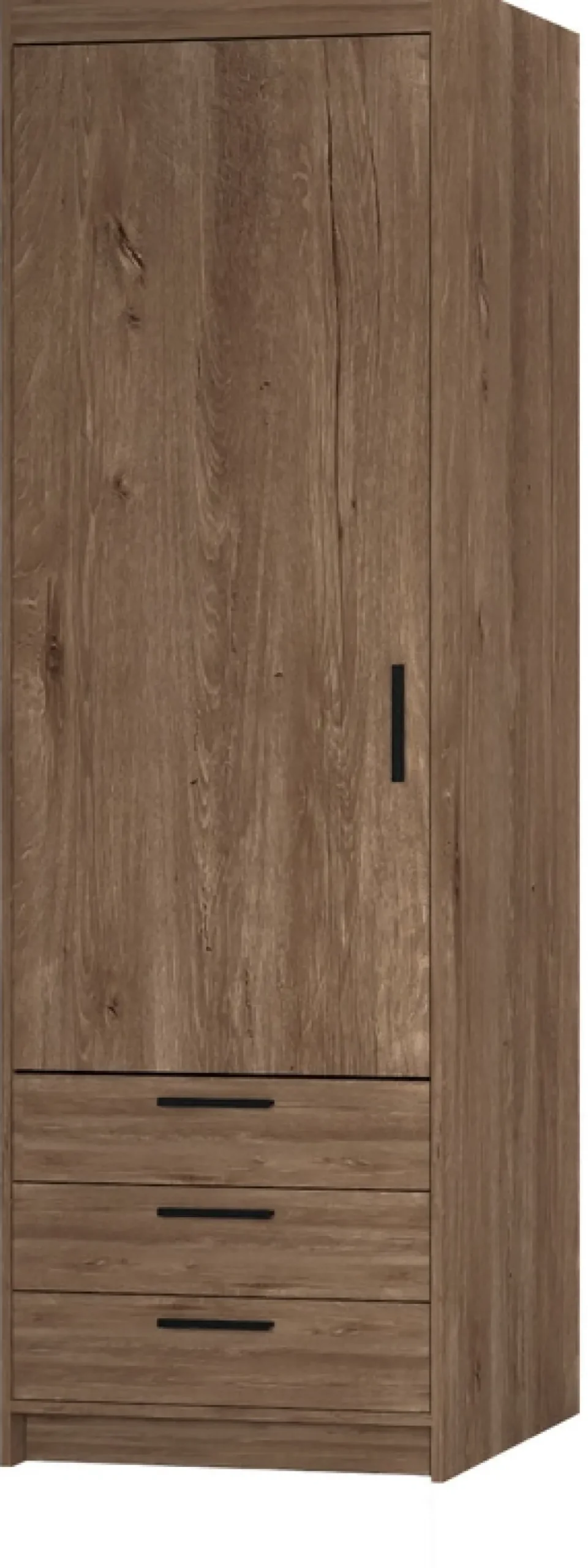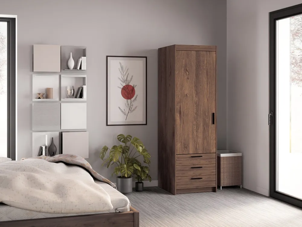 - Szafa KUBA posiada 60 cm szerokości. Za drzwiami szafy znajdują się cztery półki na ubrania i akcesoria. U dołu swoje miejsce znalazły trzy głębokie szuflady osadzone na prowadnicach kulkowych. Szafa została wykonana z płyty laminowanej 15 mm.