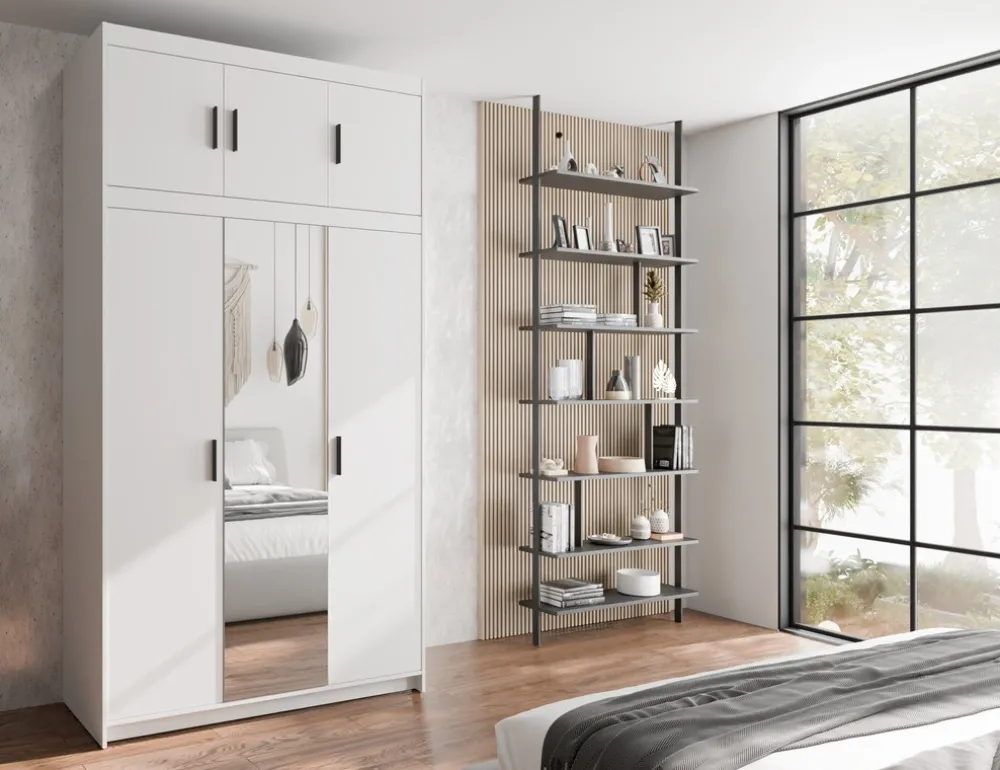 - Szafa KUBA biała z lustrem i nadstawką to eleganckie rozwiązanie do nowoczesnych wnętrz. Z 5 półkami, drążkiem i nadstawką z 3 drzwiami oraz 2 półkami oferuje przestronność. Czarne uchwyty i matowe wykończenie dodają nowoczesnego akcentu.