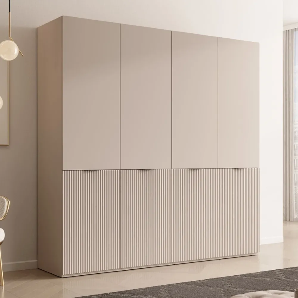 Zestaw dwóch szaf modułowych SIGMA o łącznej szerokości 202 cm to idealna propozycja dla osób ceniących nowoczesny design i doskonale zorganizowaną przestrzeń do przechowywania. Połączenie frezowanych frontów MDF z kaszmirową kolorystyką i czarnymi uchwytami tworzy stylowy i spójny duet, który doskonale wpisuje się w modne wnętrza – od garderoby po przedpokój.