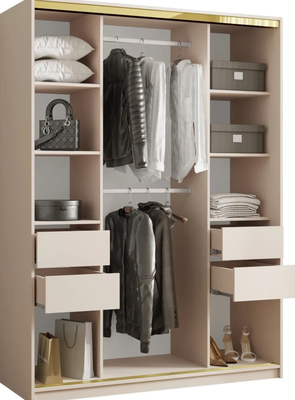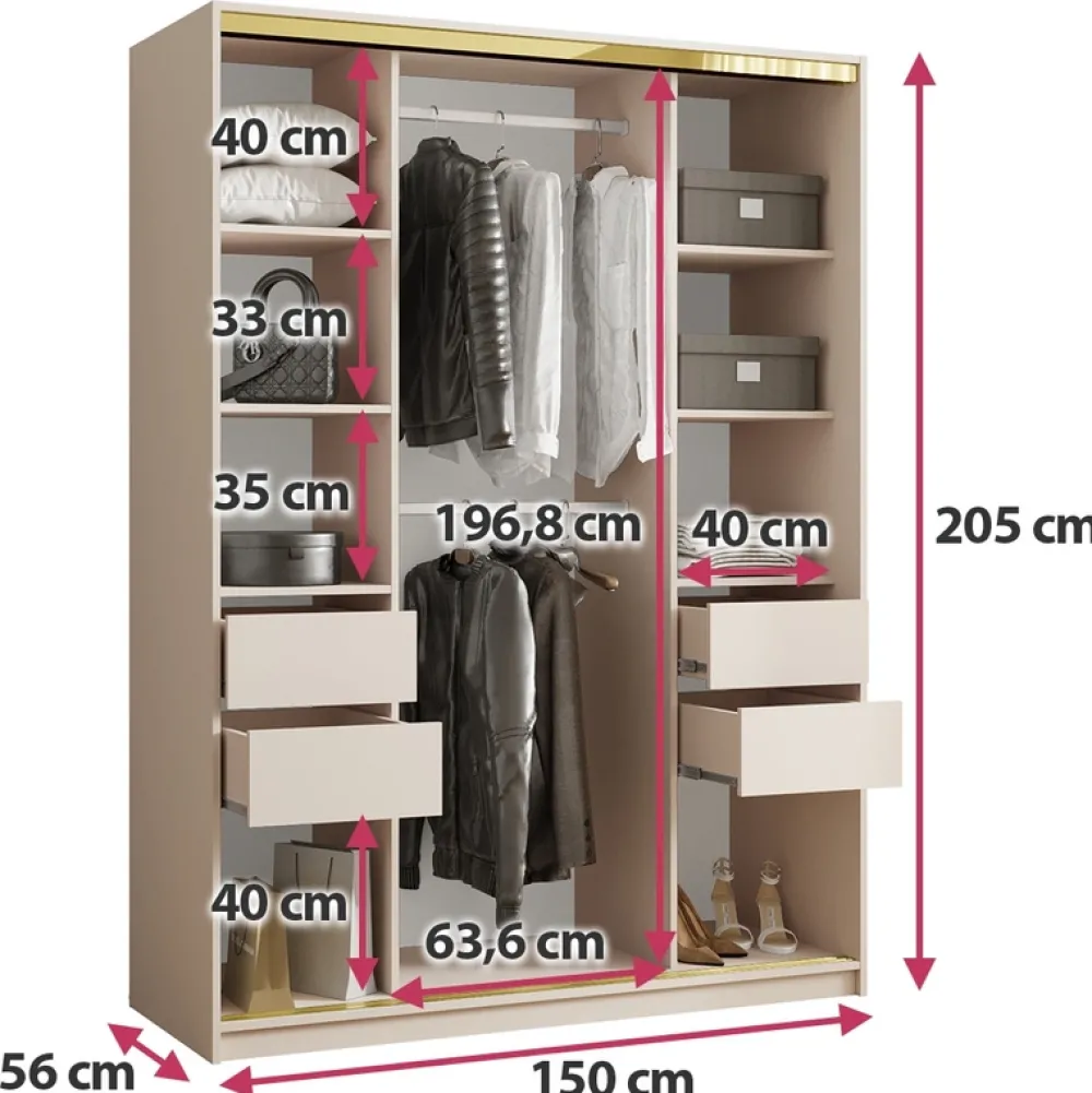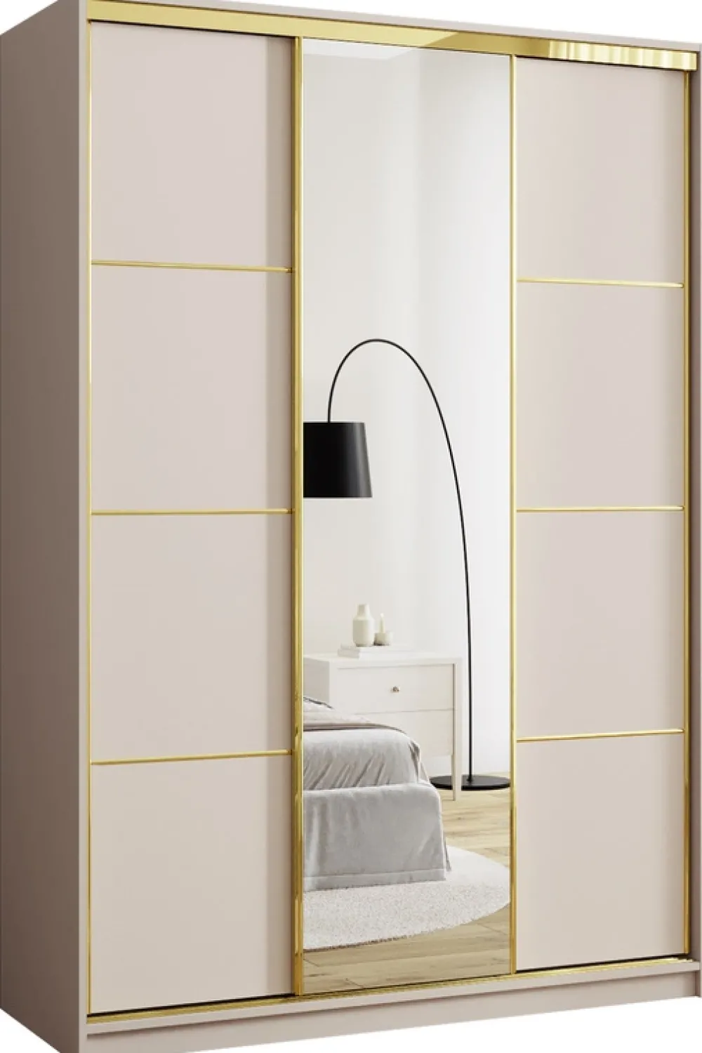 Dodaj swojej sypialni nuty luksusu i porządku dzięki eleganckiej szafie przesuwnej o szerokości 150 cm. Połączenie lustra, złotych detali i praktycznego układu wnętrza sprawia, że to idealne rozwiązanie do przechowywania ubrań, które jednocześnie staje się ozdobą wnętrza. Środkowe drzwi z lustrem optycznie powiększają przestrzeń, a złoty system przesuwny ze szprosami nadaje szafie nowoczesny, a zarazem szykowny charakter.