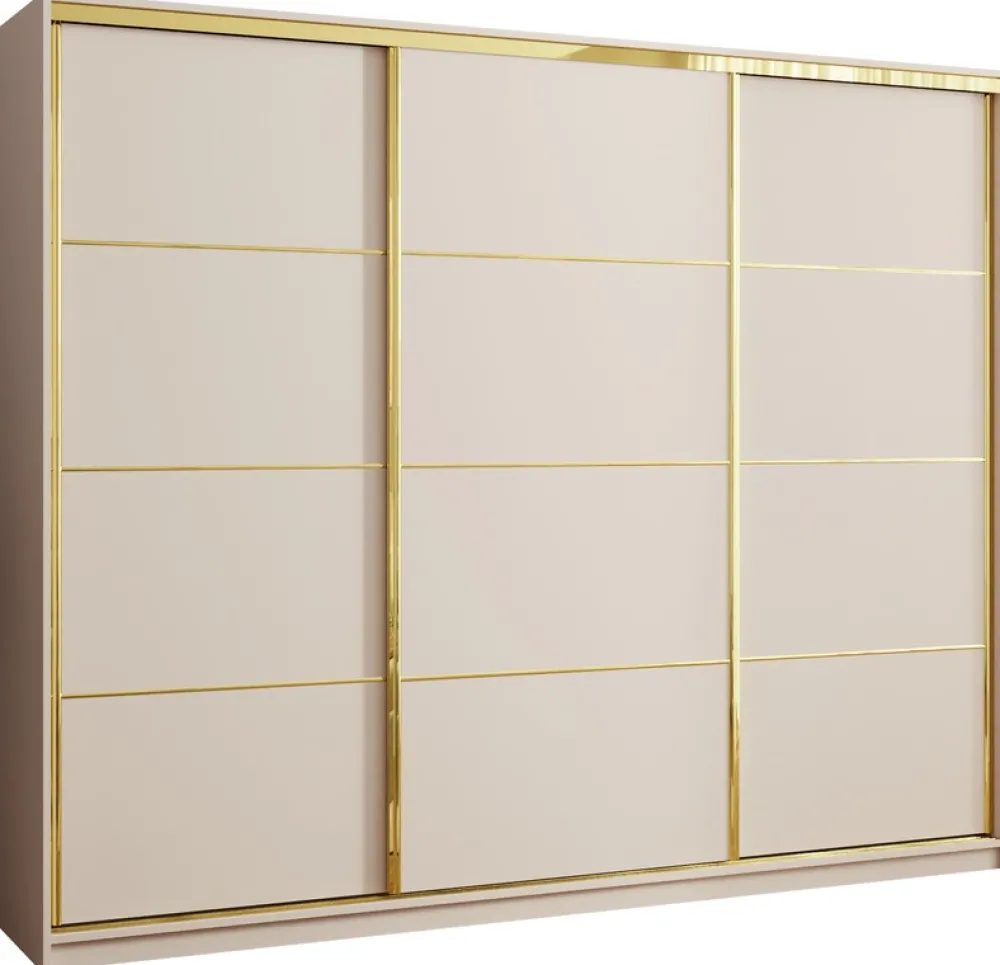 Wprowadź do swojego wnętrza elegancję i perfekcyjny porządek dzięki szafie przesuwnej o szerokości 250 cm. To mebel stworzony z myślą o praktycznym przechowywaniu, ale z wyraźnym akcentem estetycznym. Złoty stalowy system przesuwny oraz subtelne złote szprosy nadają szafie nowoczesnego, luksusowego charakteru, który doskonale wpisuje się w modne aranżacje wnętrz.
