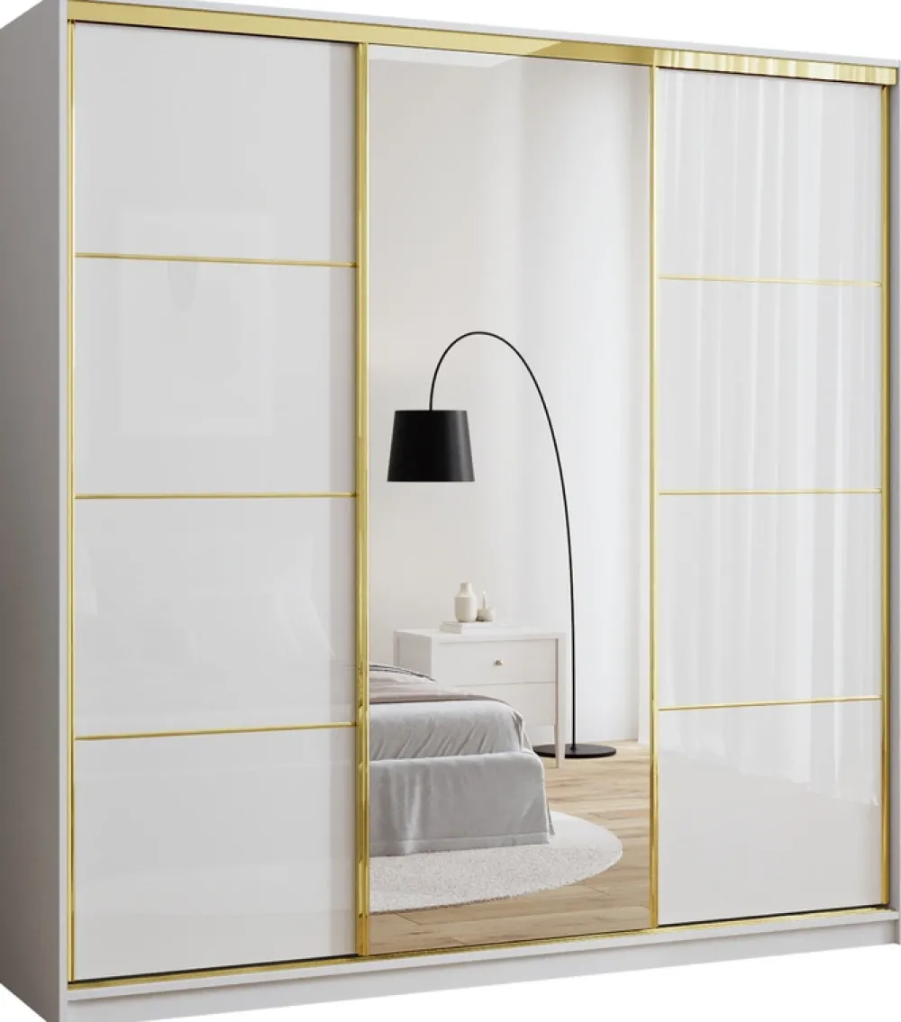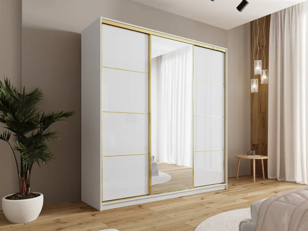 Dodaj swojej sypialni nuty luksusu i porządku dzięki eleganckiej szafie przesuwnej o szerokości 200 cm. Połączenie lustra, złotych detali i praktycznego układu wnętrza sprawia, że to idealne rozwiązanie do przechowywania ubrań, które jednocześnie staje się ozdobą wnętrza. Środkowe drzwi z lustrem optycznie powiększają przestrzeń, a złoty system przesuwny ze szprosami nadaje szafie nowoczesny, a zarazem szykowny charakter.