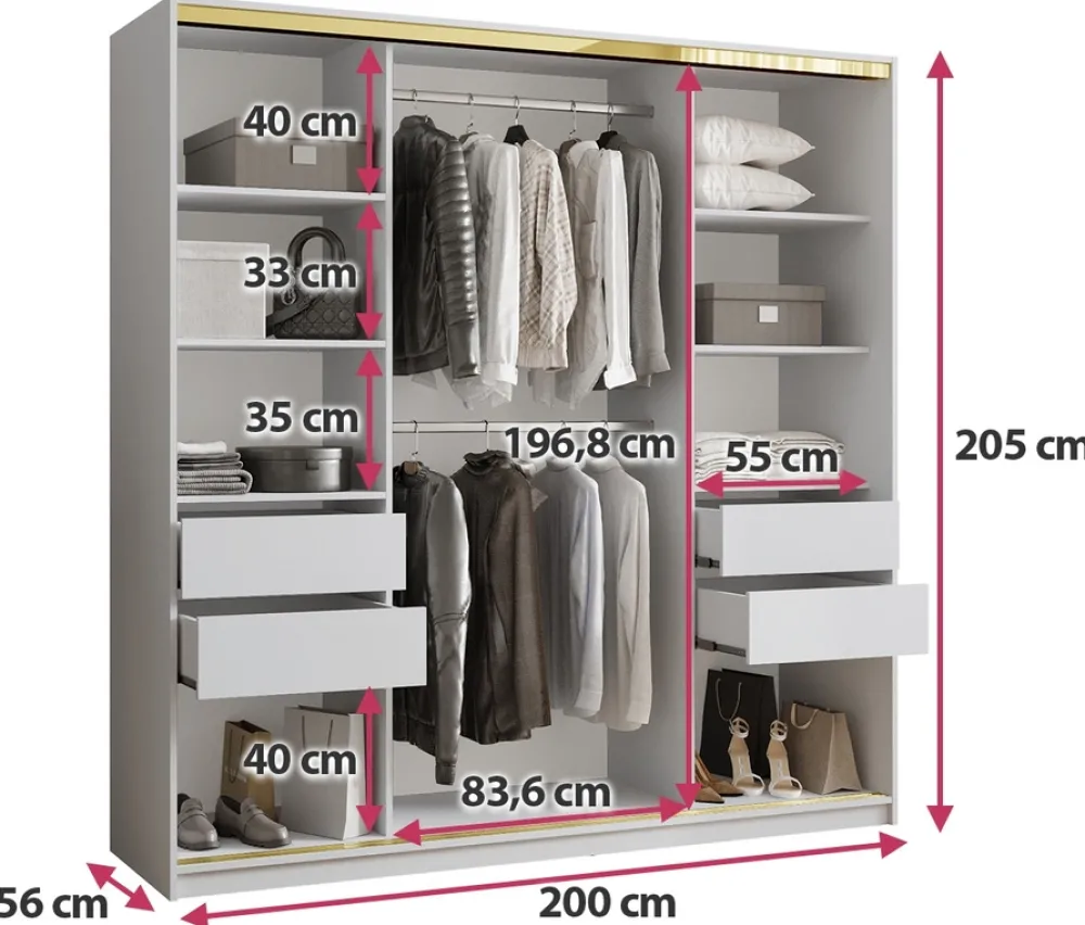 - Szafa przesuwna z lustrem 200 cm GOLD NEW charakteryzuje się pojemnym wnętrzem oraz nowoczesnym designem. Środkowe drzwi szafy zostały wzbogacone o duże lustro, wewnątrz znajduje się osiem półek na ubrania, cztery szuflady, oraz dwa drążki na wieszaki.