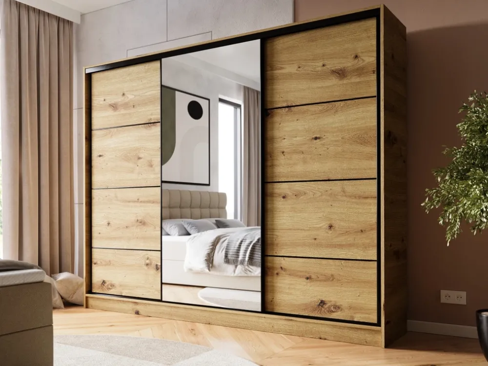 Szafa przesuwna z lustrem posiada duże lustro umieszczone na środkowych drzwiach. Oferuje ono praktyczność i wygodę, pozwalając na oglądanie całej sylwetki. Jednocześnie lustro optycznie powiększa przestrzeń, sprawiając, że pomieszczenie wydaje się jaśniejsze i bardziej przestronne.