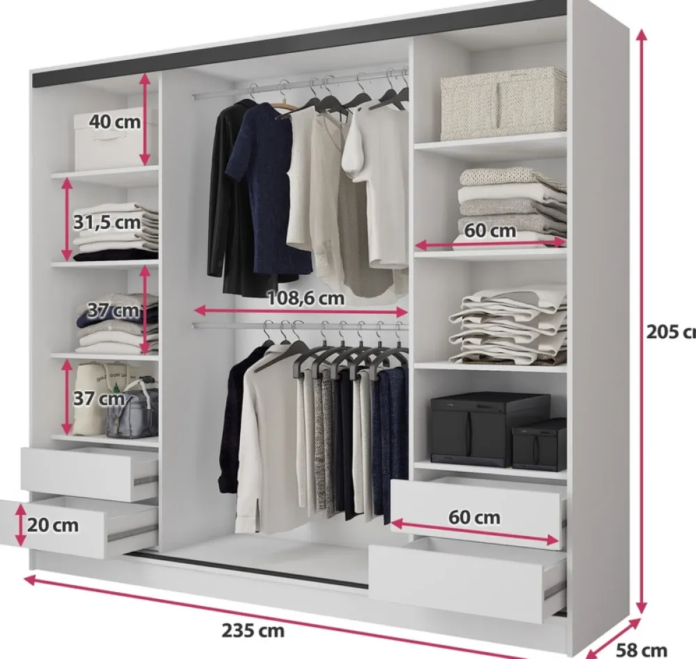 - Szafa przesuwna z lustrem BEST posiada osiem półek, cztery głębokie szuflady oraz dwa metalowe drążki na wieszaki. Dodatkowo drzwi szafy poruszają się na aluminiowym systemie przesuwnym w czarnym kolorze, który gwarantuje płynną pracę.