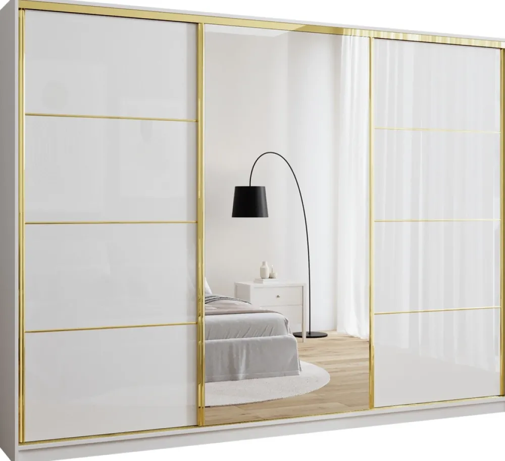 Dodaj swojej sypialni nuty luksusu i porządku dzięki eleganckiej szafie przesuwnej o szerokości 280 cm. Połączenie lustra, złotych detali i praktycznego układu wnętrza sprawia, że to idealne rozwiązanie do przechowywania ubrań, które jednocześnie staje się ozdobą wnętrza. Środkowe drzwi z lustrem optycznie powiększają przestrzeń, a złoty system przesuwny ze szprosami nadaje szafie nowoczesny, a zarazem szykowny charakter.