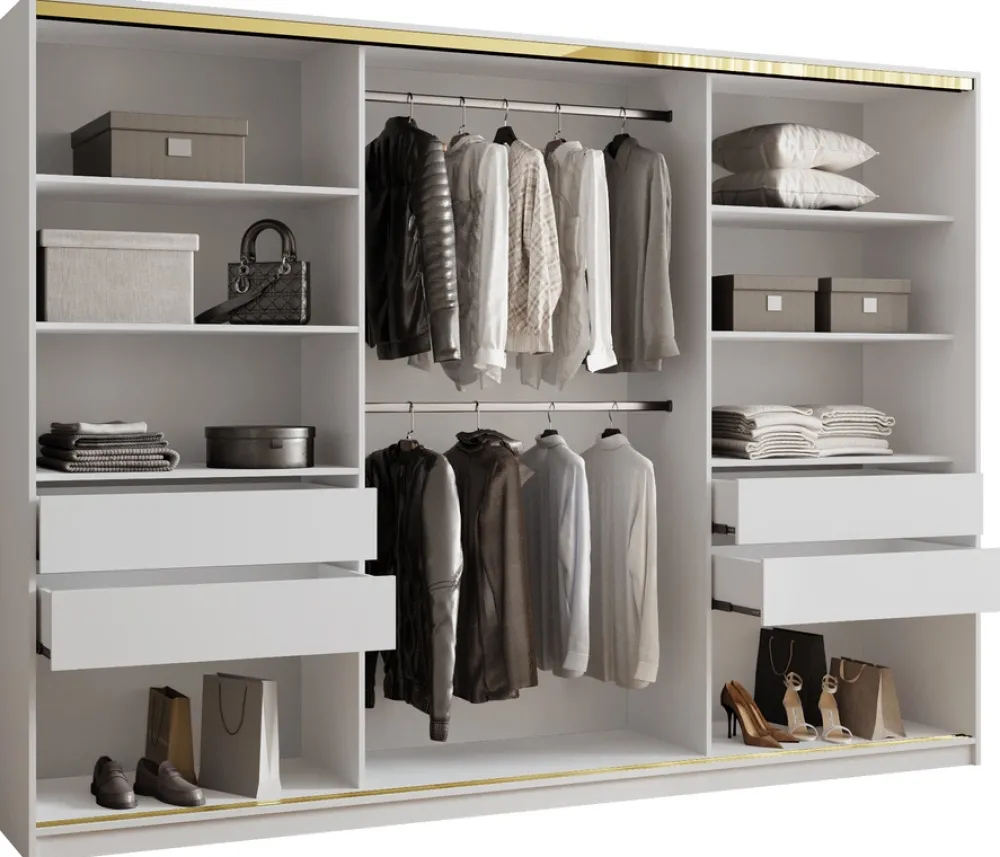 - Szafa przesuwna z lustrem 280 cm GOLD NEW charakteryzuje się pojemnym wnętrzem oraz nowoczesnym designem. Środkowe drzwi szafy zostały wzbogacone o duże lustro, wewnątrz znajduje się osiem półek na ubrania, cztery szuflady, oraz dwa drążki na wieszaki.