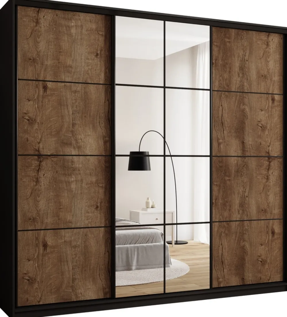 Szafa przesuwna o szerokości 250 cm to idealne rozwiązanie do dużych przestrzeni, które wymagają przemyślanej organizacji i nowoczesnego stylu. Wyposażona w stalowy system przesuwny w czarnym kolorze, zapewnia nie tylko płynną i cichą pracę, ale także podkreśla jej industrialny, modny charakter.