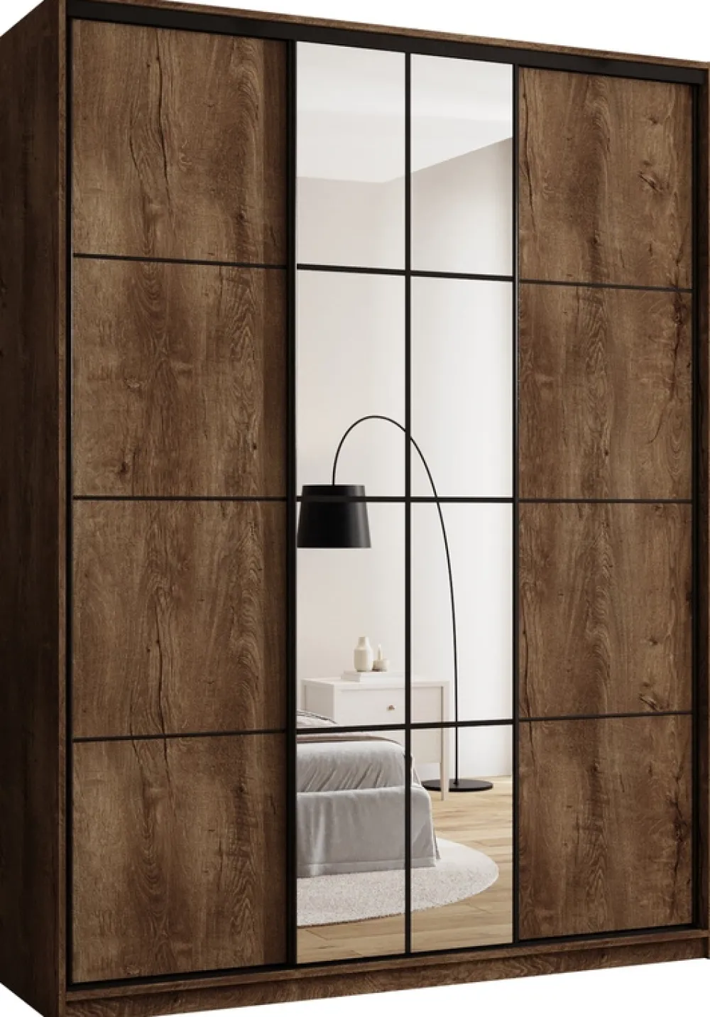Centralną część szafy zdobi lustro, które nie tylko dodaje stylu, ale także optycznie powiększa przestrzeń, wprowadzając więcej światła do pomieszczenia. To praktyczny dodatek, który sprawdzi się zarówno w sypialni, jak i w przedpokoju.
