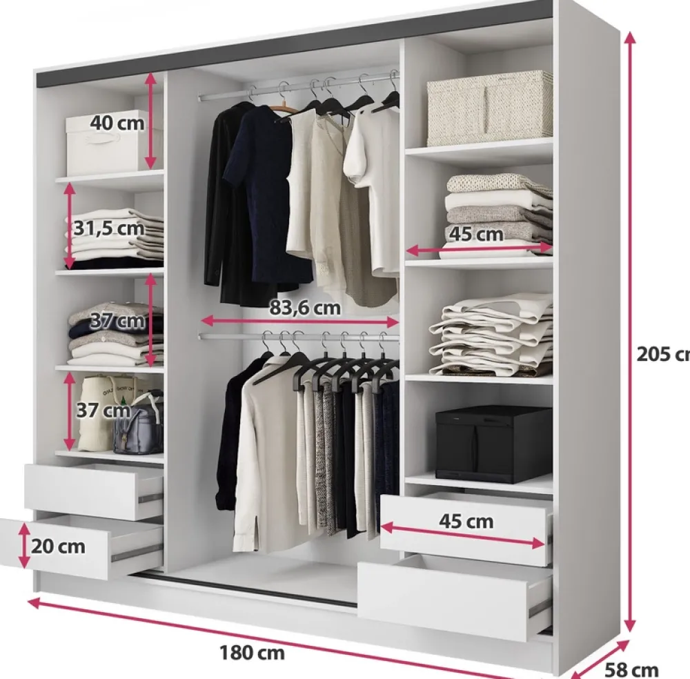 - Szafa przesuwna BEST posiada 180 cm szerokości, w skład których wchodzą cztery głębokie szuflady, osiem półek oraz dwa aluminiowe drążki na wieszaki. Środkowe drzwi szafy zostały wzbogacone o lustro, które optycznie powiększa, oraz rozjaśnia pomieszczenie