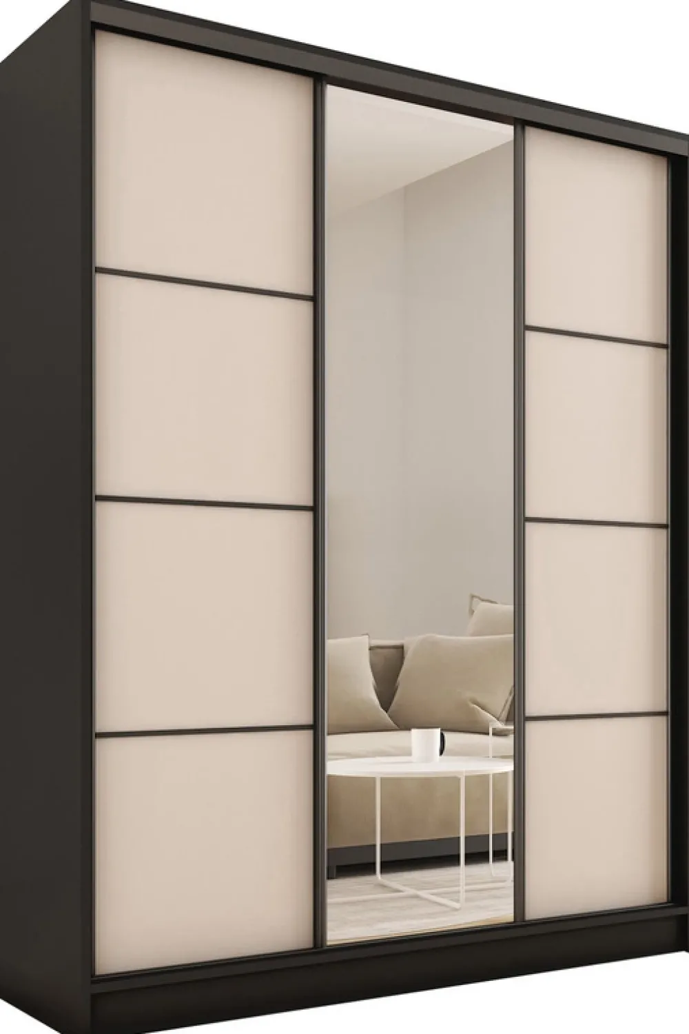 - Elegancka szafa przesuwna do sypialni LOFT. Wyposażona w lustro, cztery szuflady, dwa drążki na wieszaki. Korpus wykonany z płyty laminowanej 16 mm w kolorze czarnym, natomiast front w kolorze beżu piaskowego. Krawędzie zabezpieczone okleiną ABS.