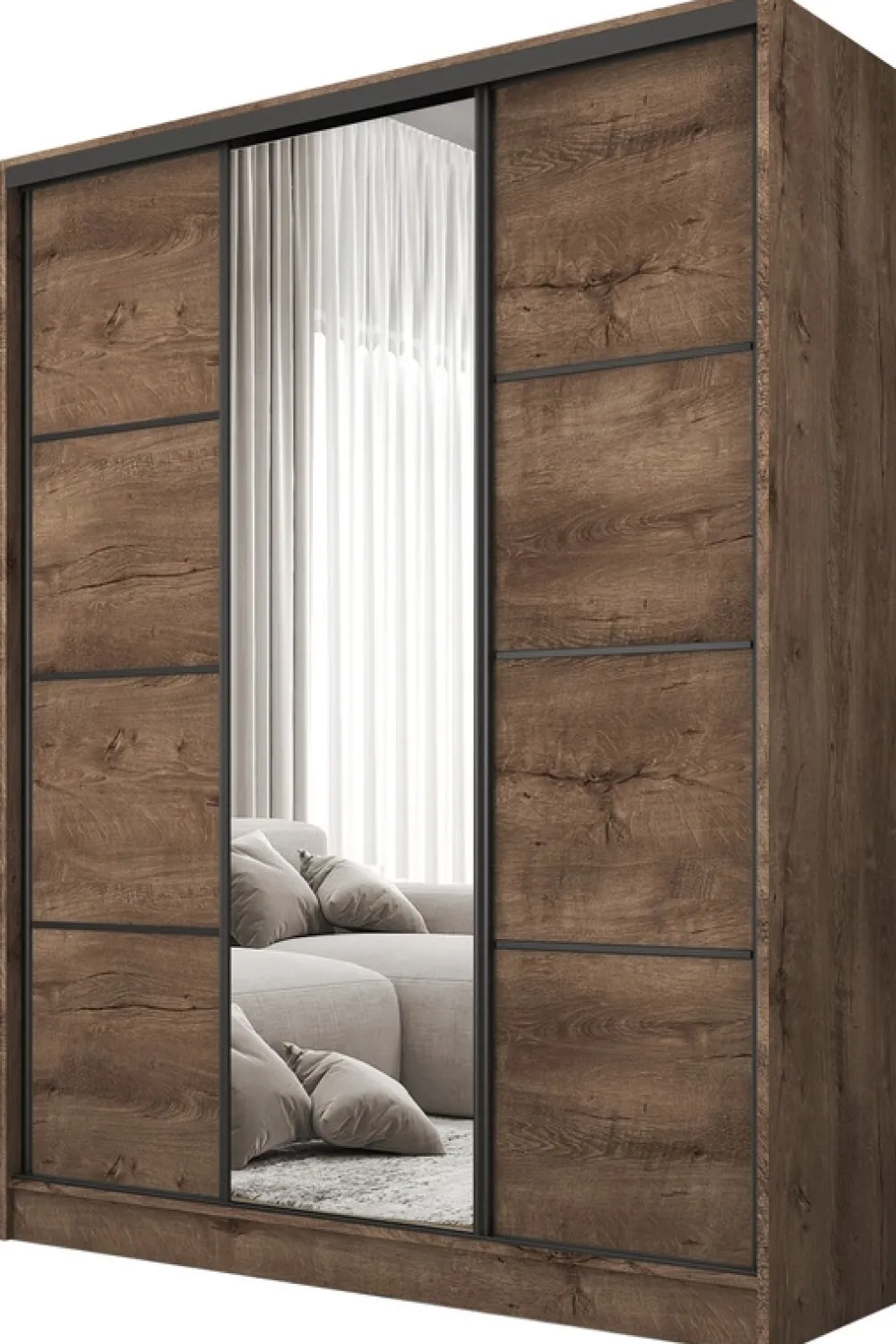 - Szafa przesuwna z lustrem 150 cm BEST posiada lustro umieszczone na środkowych drzwiach, które optycznie powiększa oraz rozjaśnia pomieszczenie. Wewnątrz szafy znajduje się osiem półek, dwa drążki na wieszaki oraz cztery głębokie szuflady.
