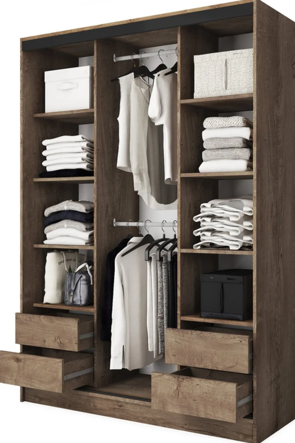 Dodatkowo, szafa wyposażona jest w cztery głębokie szuflady, które świetnie sprawdzą się do przechowywania drobniejszych przedmiotów. Szuflady są łatwe w użyciu i zapewniają dodatkową organizację przestrzeni.