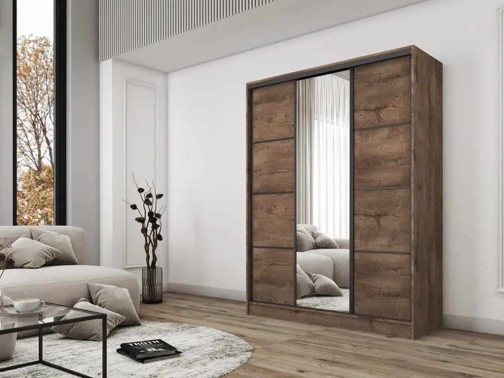 Nowoczesna szafa przesuwna, o szerokości 180 cm, to nie tylko mebel – to centrum Twojej sypialni. Jej nowoczesna stylistyka, podkreślona przez lustro, które optycznie powiększa przestrzeń i dodaje jej blasku. Idealnie komponuje się z każdym wnętrzem, podkreślając jego charakter.