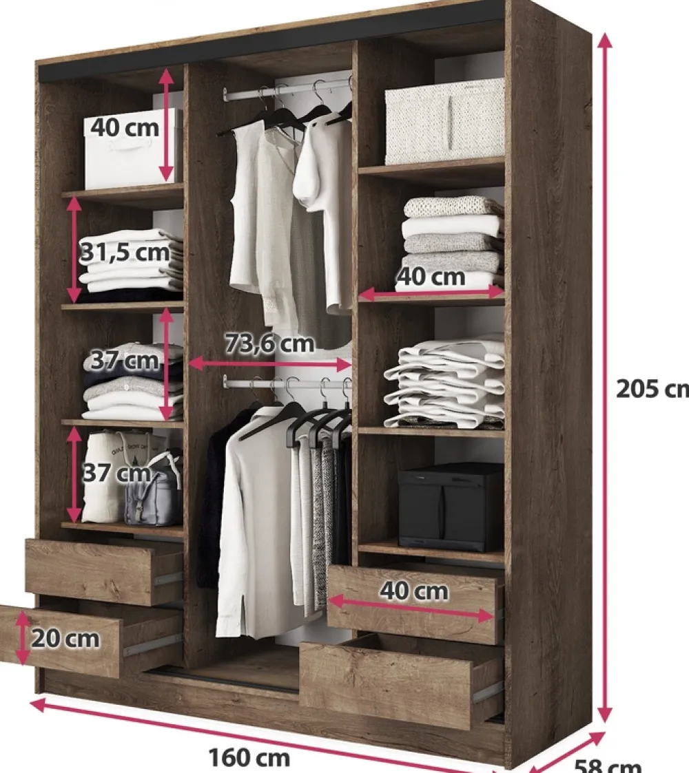 Dwa metalowe drążki na wieszaki to gwarancja trwałości i wytrzymałości. Możesz na nich powiesić swoje płaszcze, sukienki czy koszule bez obaw o przeciążenie. Aluminiowy system przesuwny szafy gwarantuje płynne i ciche działanie drzwi, co sprawia, że korzystanie z niej to czysta przyjemność.