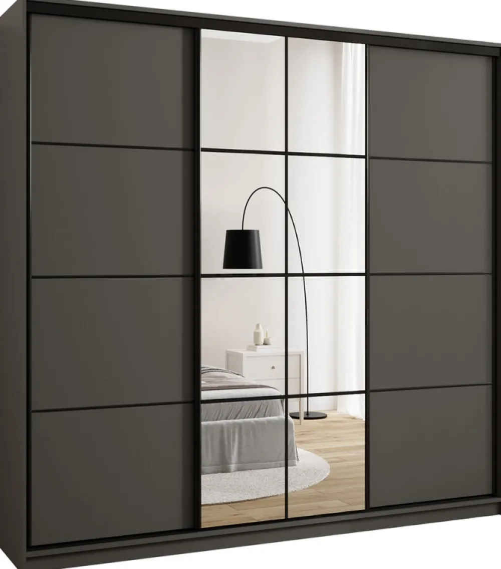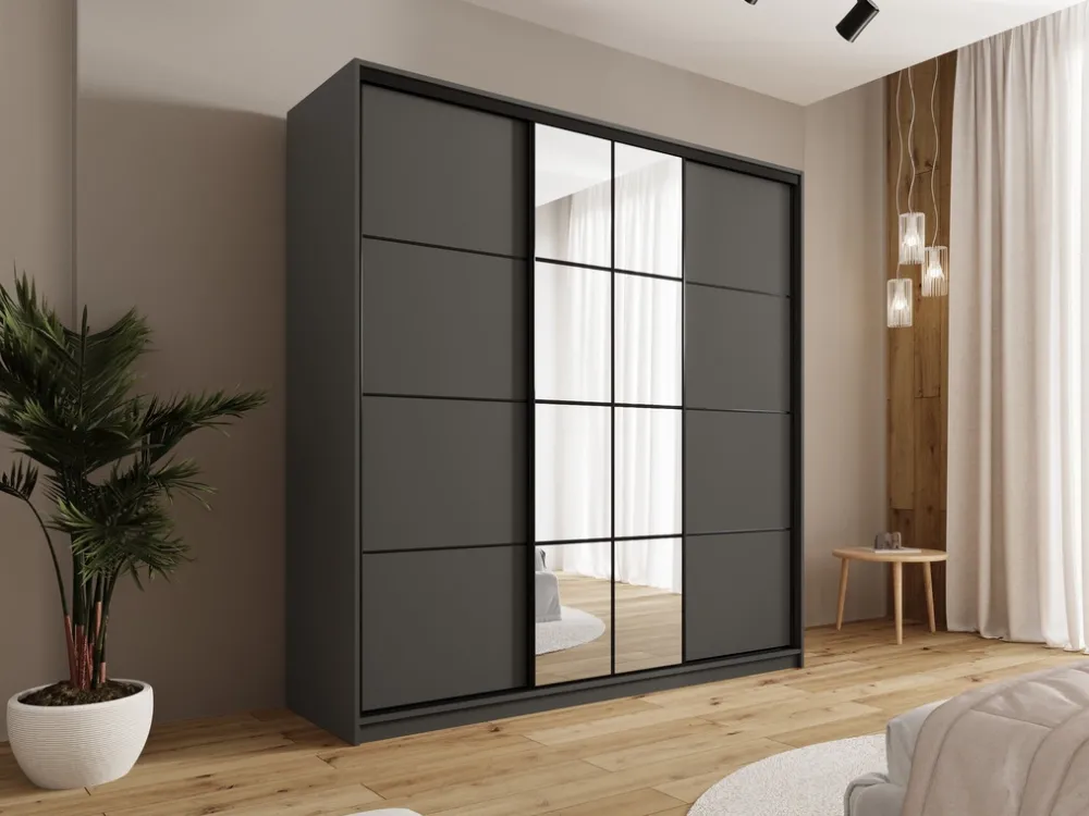 Nasza szafa z lustrem 200 cm wyróżnia się nowoczesnym wyglądem dzięki trzem drzwiom na stalowym systemie przesuwnym w eleganckim, czarnym kolorze. Czarne stalowe uchwyty dodają meblowi wyjątkowego charakteru, a jednocześnie zapewniają solidność i długowieczność użytkowania. System przesuwny umożliwia łatwe otwieranie i zamykanie drzwi bez potrzeby zajmowania dodatkowej przestrzeni.