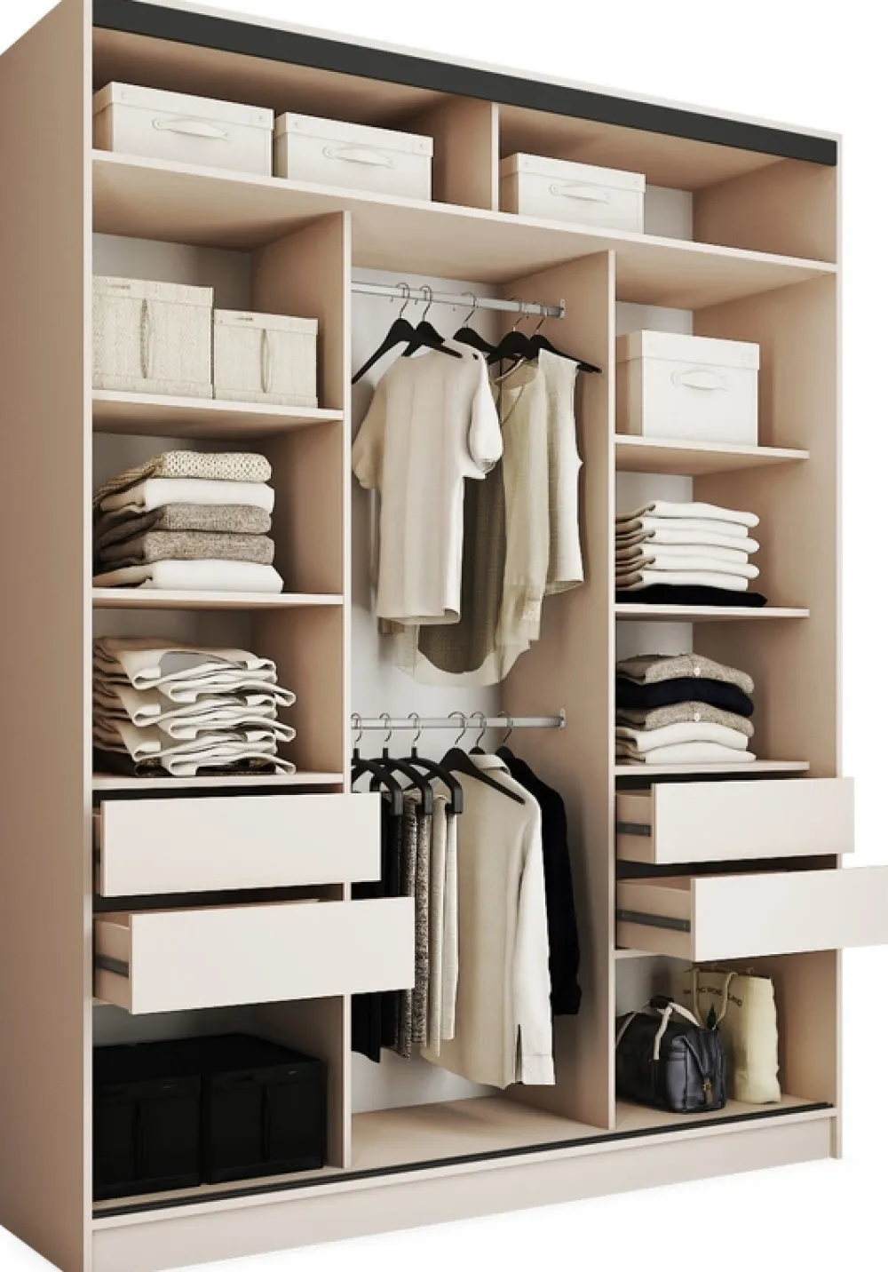Cztery szuflady umieszczone po prawej i lewej części szafy są wyposażone w prowadnice kulkowe, co gwarantuje płynne i ciche otwieranie. Są idealne do przechowywania mniejszych przedmiotów, takich jak bielizna, akcesoria czy dokumenty. Dzięki nim, każdy drobiazg będzie miał swoje miejsce, a Ty będziesz cieszyć się porządkiem.
