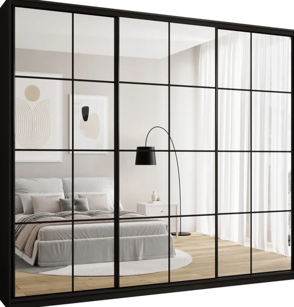 - Lustro szafy posiada dekoracyjne szprosy w czarnym kolorze o grubości 16 mm. Lustro po rozpakowaniu posiada już zamontowane szprosy.